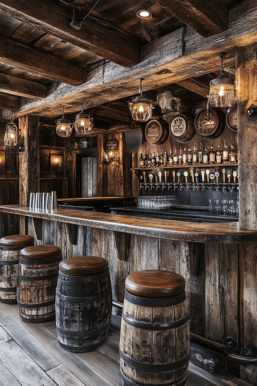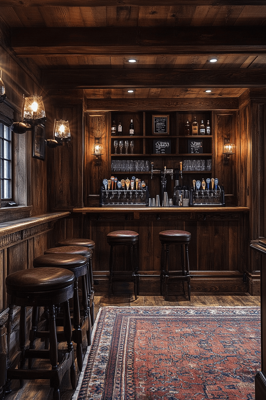 Warm character and nostalgic charm define basement bar ideas inspired by classic taverns, where aged wood finishes, cozy lighting, and timeworn details create a deeply inviting atmosphere. The bar feels personal and lived-in rather than staged or overly designed. Traditional stools, reclaimed materials, and subtle vintage accents encourage relaxed conversation and long evenings. This style is perfect for those who value comfort and authenticity over trends. The result is a space that feels familiar and comforting. Explore rustic basement bar ideas that celebrate warmth and character.