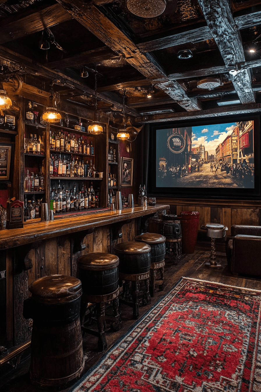 Entertainment-focused styling transforms basement bar ideas into immersive cinema-inspired spaces, where themed decor and practical layouts enhance movie nights. Snack stations and drink counters improve convenience. The atmosphere feels playful and engaging. This setup blends entertainment with hospitality. It is perfect for film lovers. Explore cinema-themed basement bar ideas that elevate movie nights.