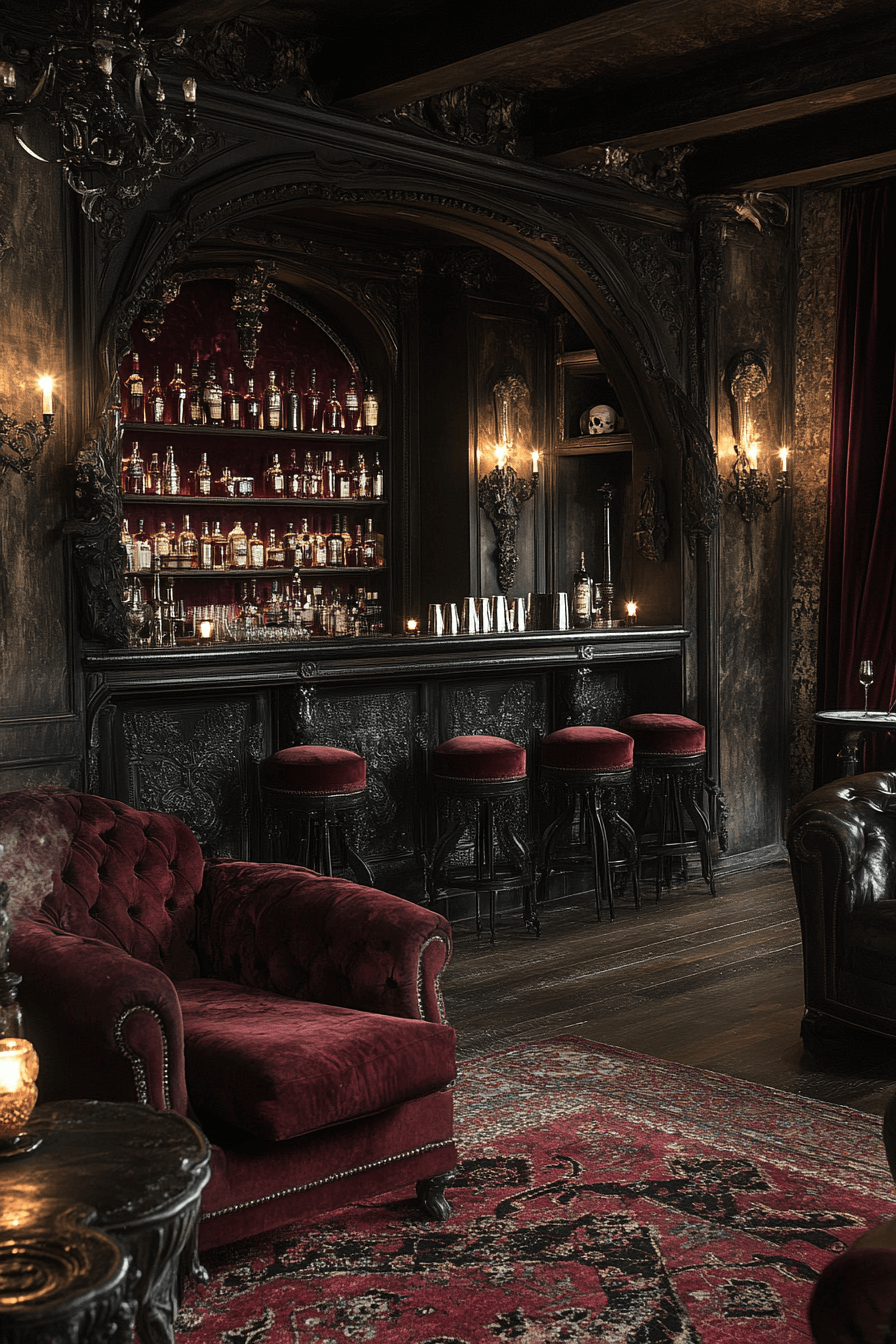 Dramatic sophistication defines basement bar ideas influenced by gothic design, where deep tones, ornate details, and moody lighting create intrigue. Textured materials add depth and richness. The space feels romantic and bold. This style leaves a lasting impression. It suits those who enjoy theatrical design. Discover gothic basement bar ideas with striking allure.