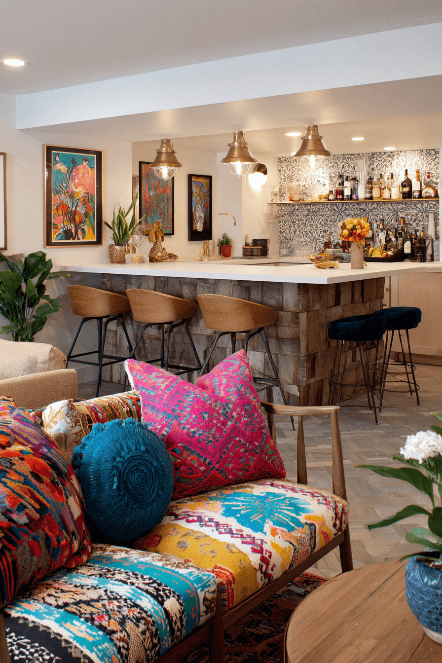 Free-spirited expression defines basement bar ideas inspired by bohemian style, where layered textiles, mixed materials, and relaxed seating create warmth. Soft lighting enhances the cozy atmosphere. The space feels artistic and personal. This design encourages connection and creativity. It reflects individuality beautifully. Explore boho basement bar ideas full of creative charm.