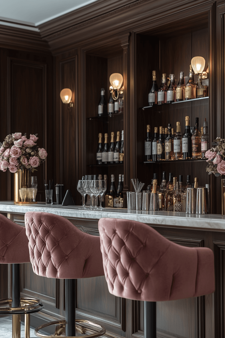 Glamorous sophistication elevates basement bar ideas focused on cocktail culture, where glossy countertops, metallic finishes, and curated seating create a refined social setting. Soft, moody lighting enhances the ambiance and encourages lingering conversations. Carefully arranged bottles and glassware double as decor. The space feels intimate yet luxurious. Every detail supports an upscale entertaining experience. Discover chic basement bar ideas that bring cocktail-lounge elegance home.