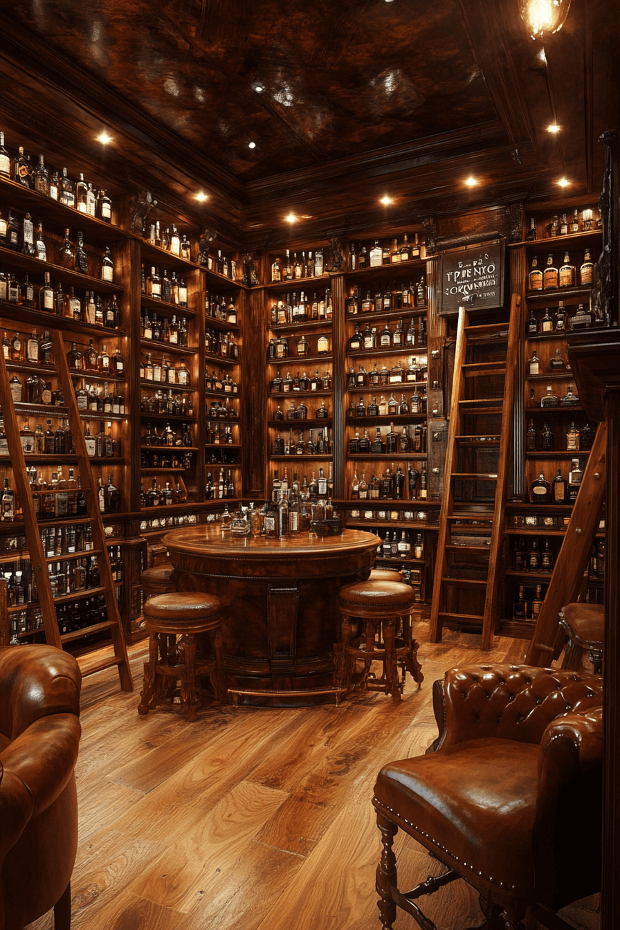 Intellectual charm defines basement bar ideas that combine a personal library atmosphere with refined entertaining, where shelving, comfortable seating, and warm lighting create a multifunctional retreat. Bottles and books coexist seamlessly as part of the design. The space encourages thoughtful conversation and unhurried evenings. Every element feels intentional and inviting. This layout supports both relaxation and hosting. Explore liquor library basement bar ideas that feel personal and distinctive.