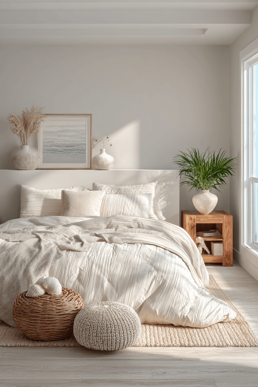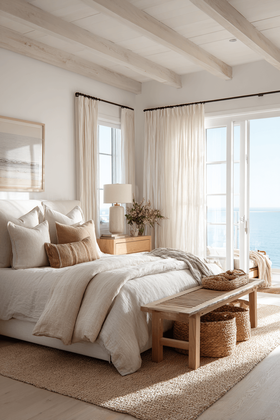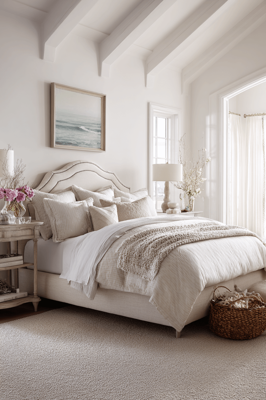 Shell-inspired softness brings gentle beauty into these beach bedroom ideas. Creamy whites and faint blush undertones echo organic coastal shapes. Rounded décor enhances the delicate aesthetic. Reflective accents amplify brightness. The mood feels serene and luminous. Click to introduce shell-inspired calm into your bedroom.