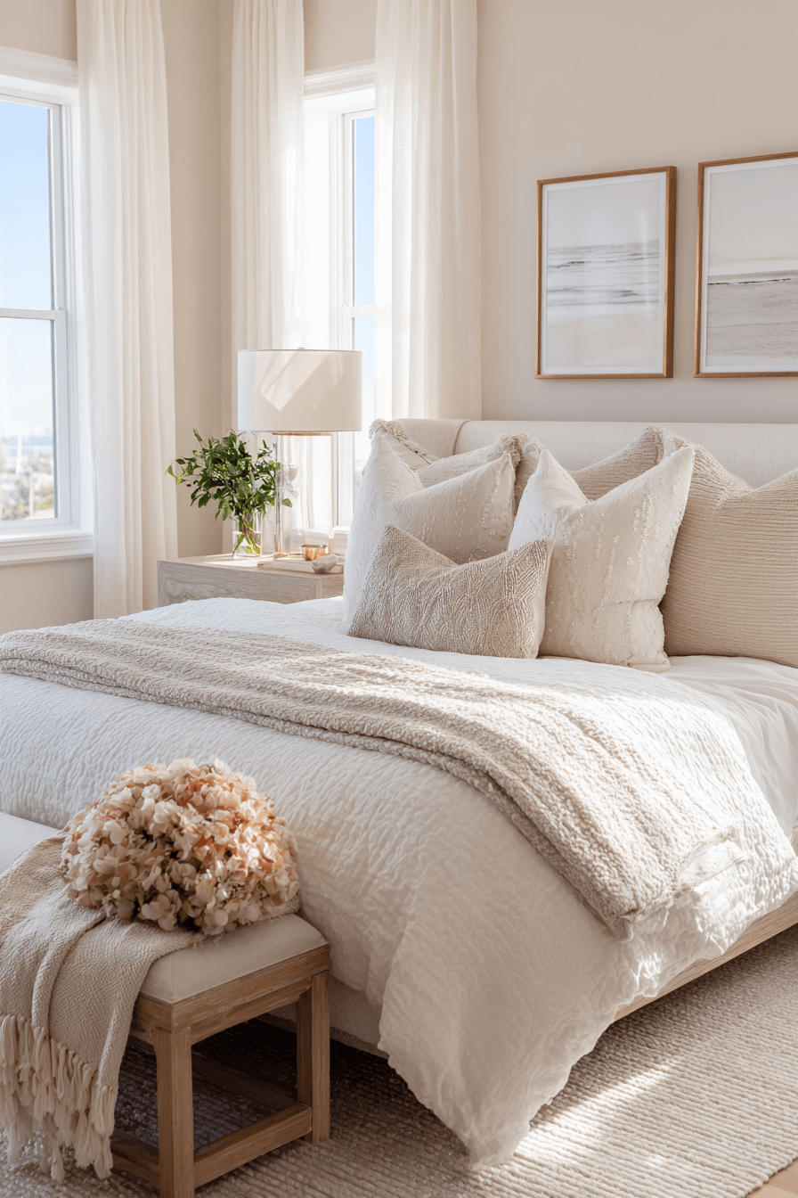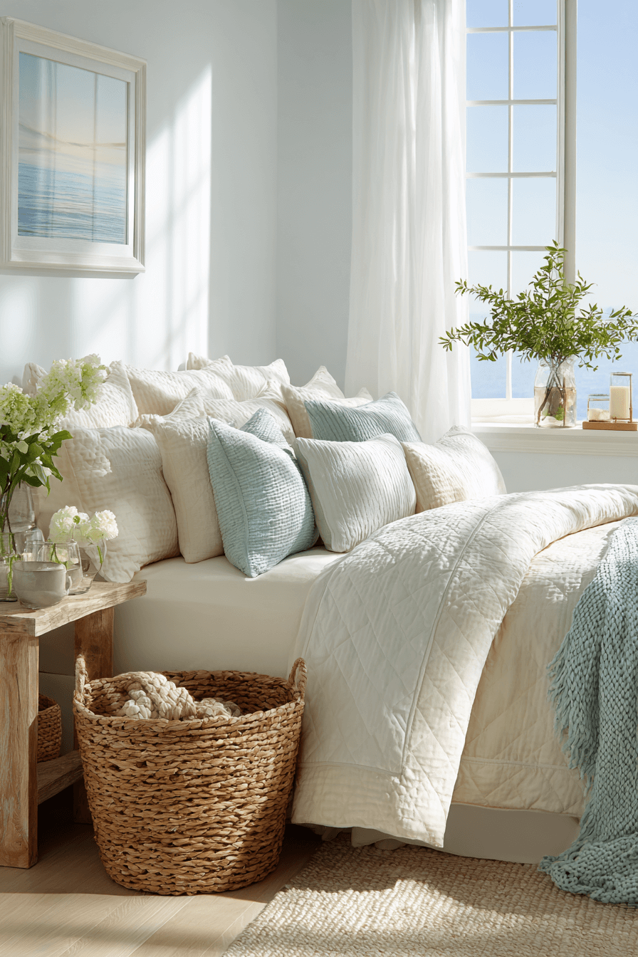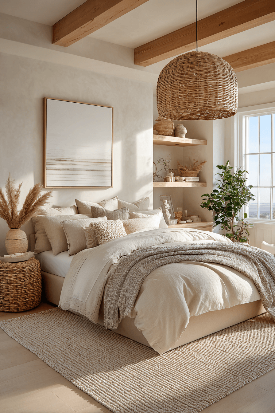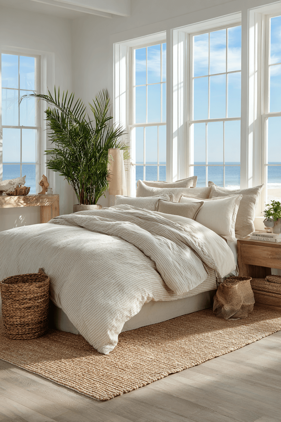 Shell-inspired softness brings gentle beauty into these beach bedroom ideas. Creamy whites and faint blush undertones echo organic coastal shapes. Rounded décor enhances the delicate aesthetic. Reflective accents amplify brightness. The mood feels serene and luminous. Click to introduce shell-inspired calm into your bedroom.