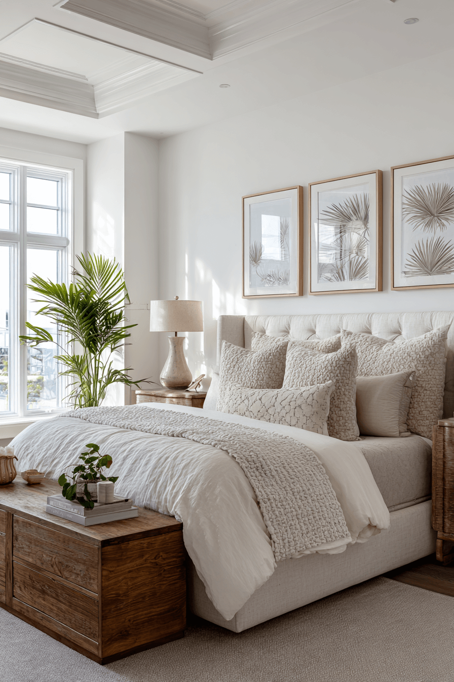 Subtle tropical accents refresh these beach bedroom ideas without overwhelming the design. Soft palm motifs, neutral backdrops, and natural textures create balance. Keeping patterns restrained ensures the space remains soothing. Warm woods and layered fabrics add dimension. The room feels vacation-ready all year long. Tap to add a whisper of tropical flair to your bedroom.