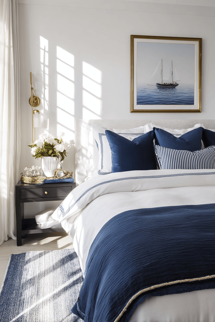 These beach bedroom ideas give maritime style a sleek contemporary edge. Deep navy contrasts with crisp white for bold clarity. Clean-lined furniture prevents heaviness. Brass accents add subtle warmth. The overall look feels polished yet relaxed. Tap to embrace modern maritime elegance.