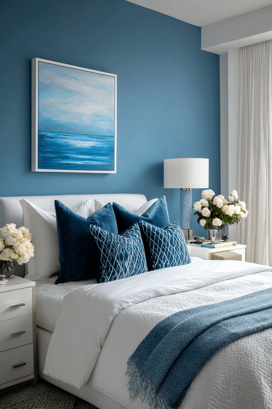 Ocean blue and crisp white make these beach bedroom ideas instantly refreshing. The color pairing evokes calm and depth without overpowering the room. Simple furniture keeps the bold hue feeling intentional. Lighter shades soften the overall look. The balance creates a space that feels energizing yet serene. Tap to design your own ocean-inspired oasis.