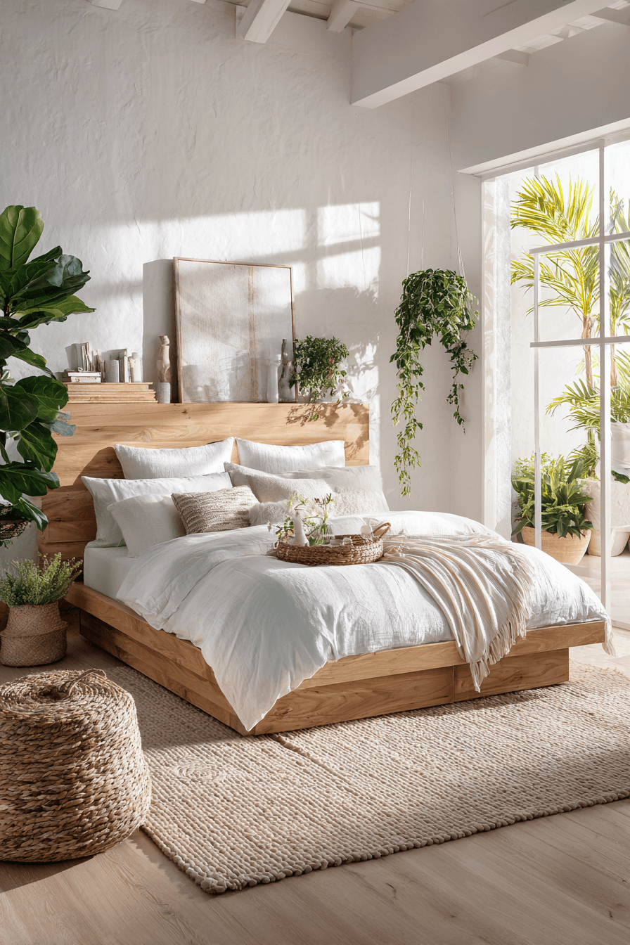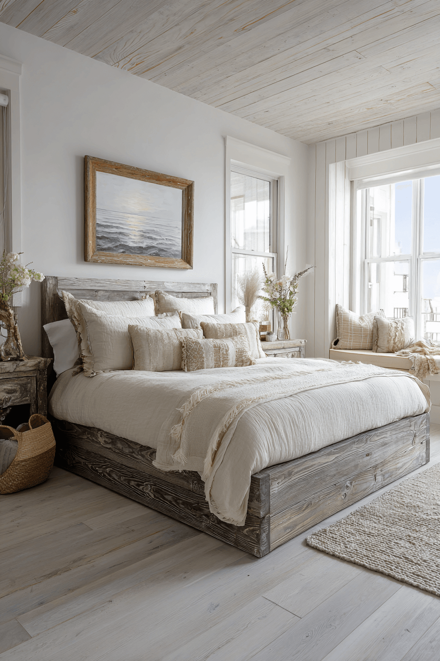 Driftwood finishes anchor these beach bedroom ideas with organic depth. Weathered wood furniture and soft gray undertones mimic sun-bleached coastal treasures. This works beautifully because it introduces texture while maintaining a neutral palette. Creamy bedding and simple décor keep the space feeling curated rather than busy. The wood’s natural grain adds subtle character. Tap to bring driftwood-inspired warmth into your bedroom.