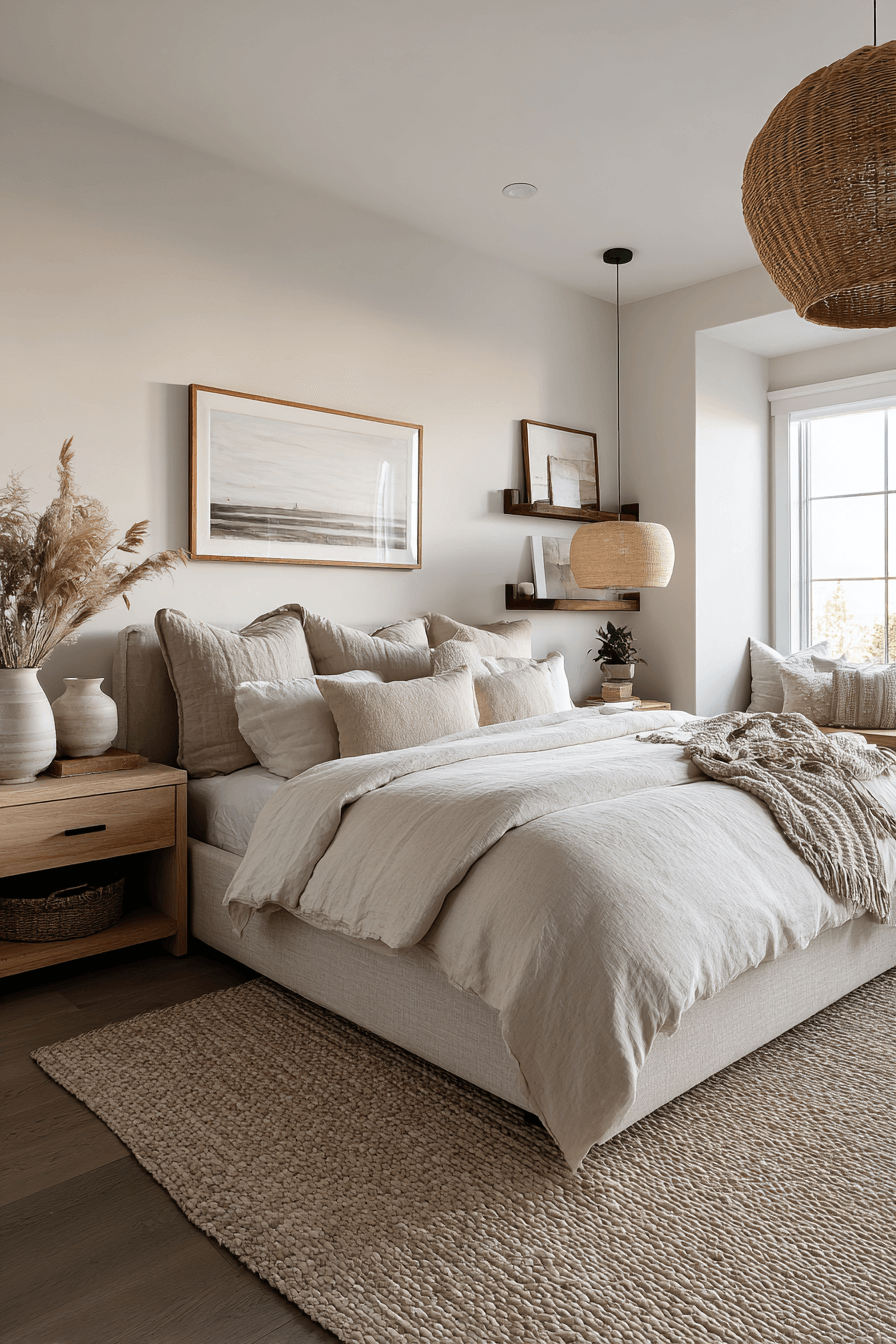 These beach bedroom ideas blend bohemian warmth with relaxed seaside charm. Woven wall art, layered rugs, and neutral bedding create depth and personality. Both styles celebrate natural materials and soft palettes, making the mix feel effortless. Hints of ocean blue keep the look grounded in coastal inspiration. The result feels cozy yet refined. Tap to explore your own coastal boho bedroom vibe.