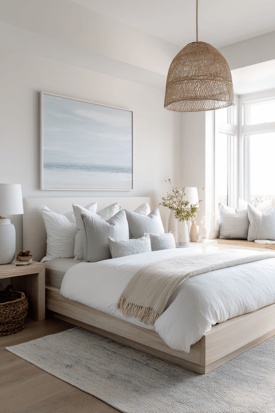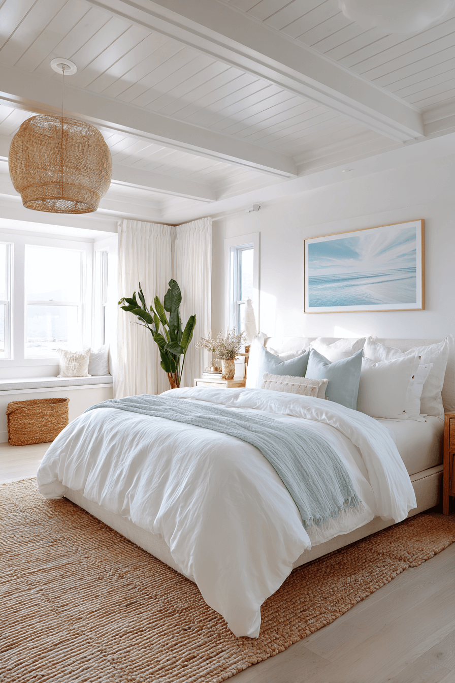 Bright white elements define these beach bedroom ideas, amplifying natural light and spaciousness. White walls and bedding reflect sunshine, making even compact rooms feel expansive. Layered textures like rattan lighting and woven rugs prevent the space from feeling stark. Subtle ocean-toned accents add gentle coastal influence. The overall look feels clean, fresh, and timeless. Click to brighten your bedroom with an airy coastal glow.