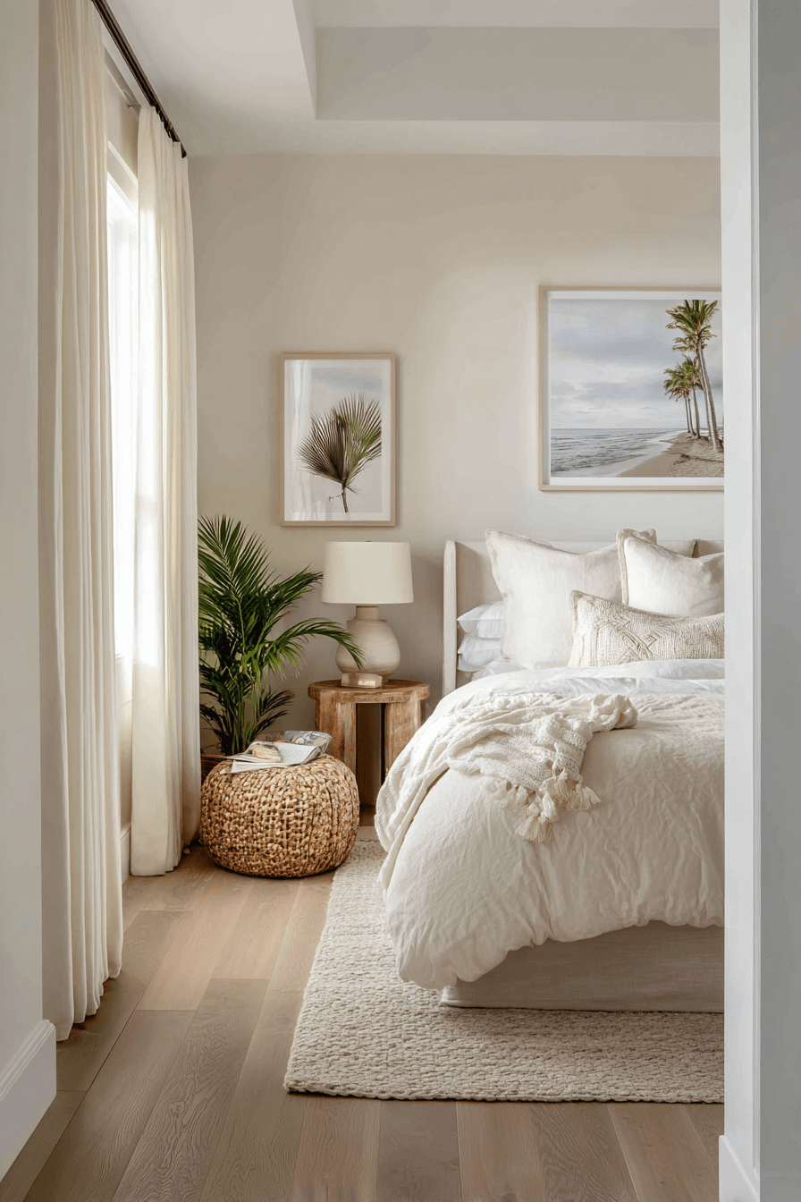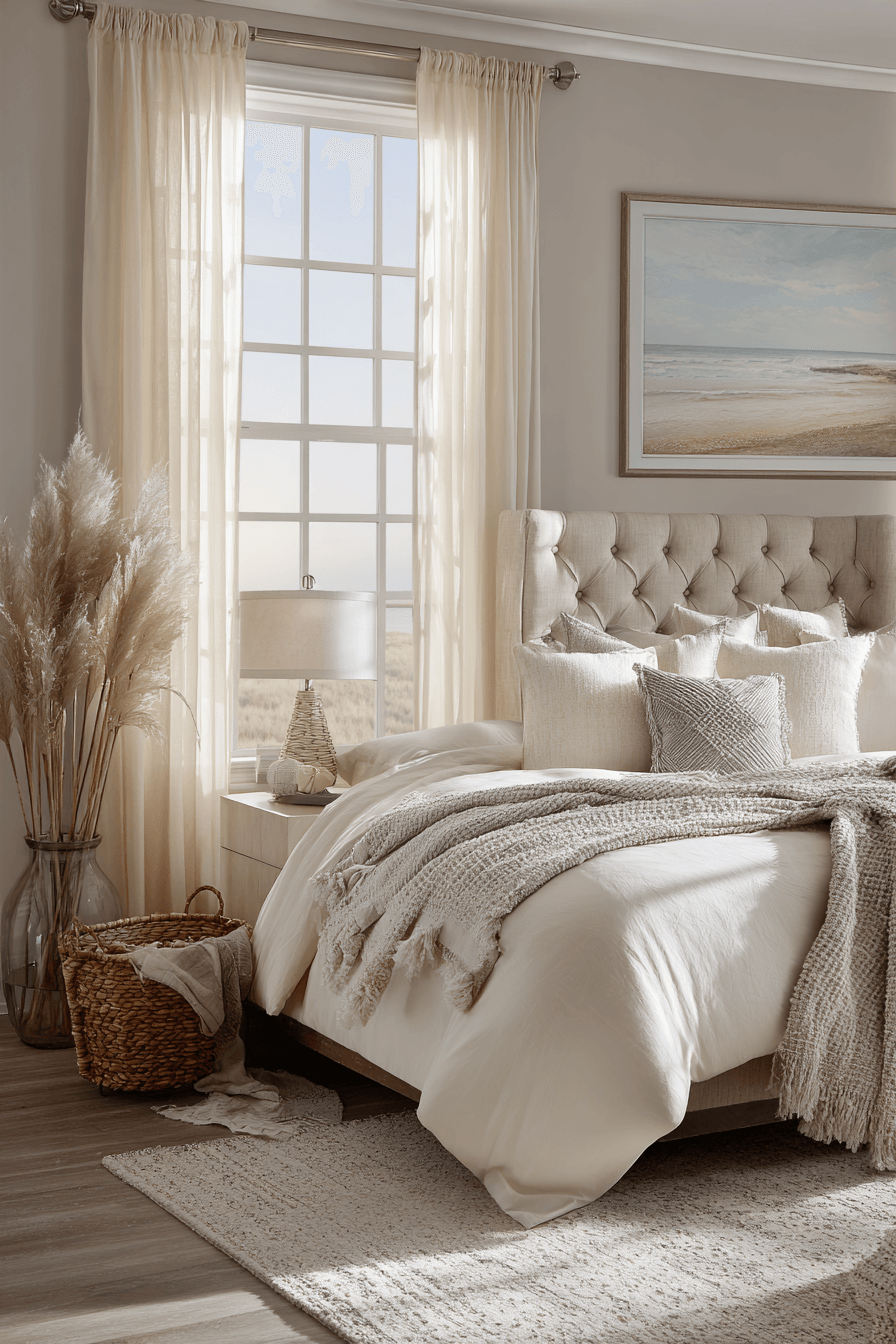 Soft curves and elevated textures define these beach bedroom ideas. Rounded décor elements and plush layers create warmth. The restrained palette keeps the room sophisticated. Comfort and refinement blend seamlessly. The atmosphere feels welcoming and polished. Click to embrace relaxed coastal elegance.
