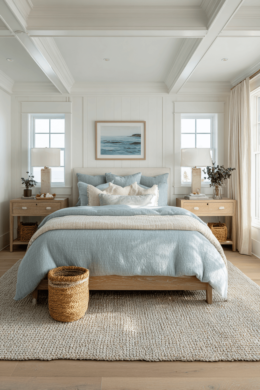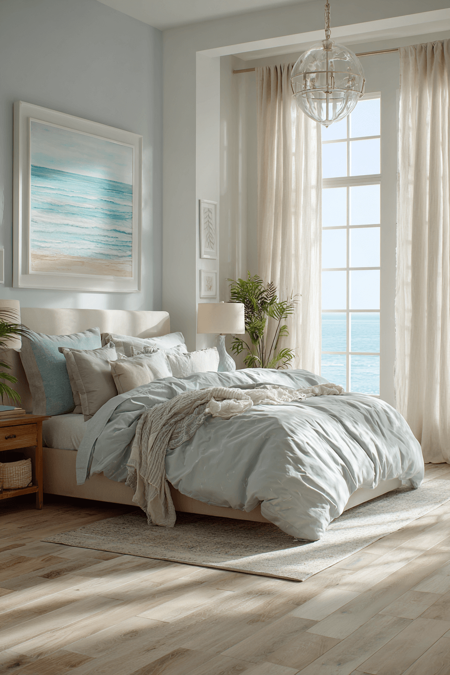 Soft aqua and gentle gray tones define these beach bedroom ideas with tranquil ease. The palette echoes shallow water meeting sand. Simple furnishings prevent distraction. Layered lighting enhances warmth. The space feels deeply relaxing. Tap to create your own calm tide bedroom.