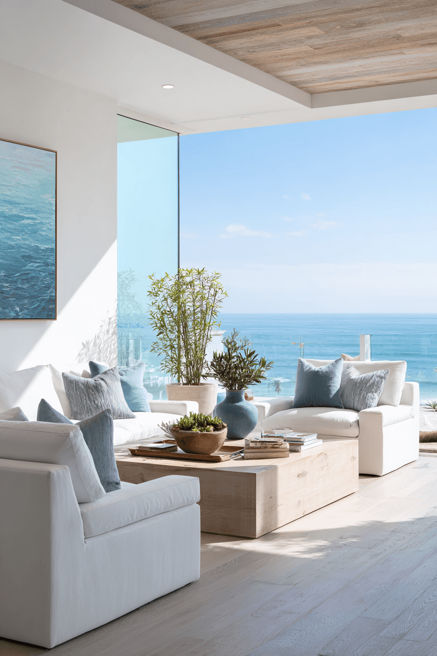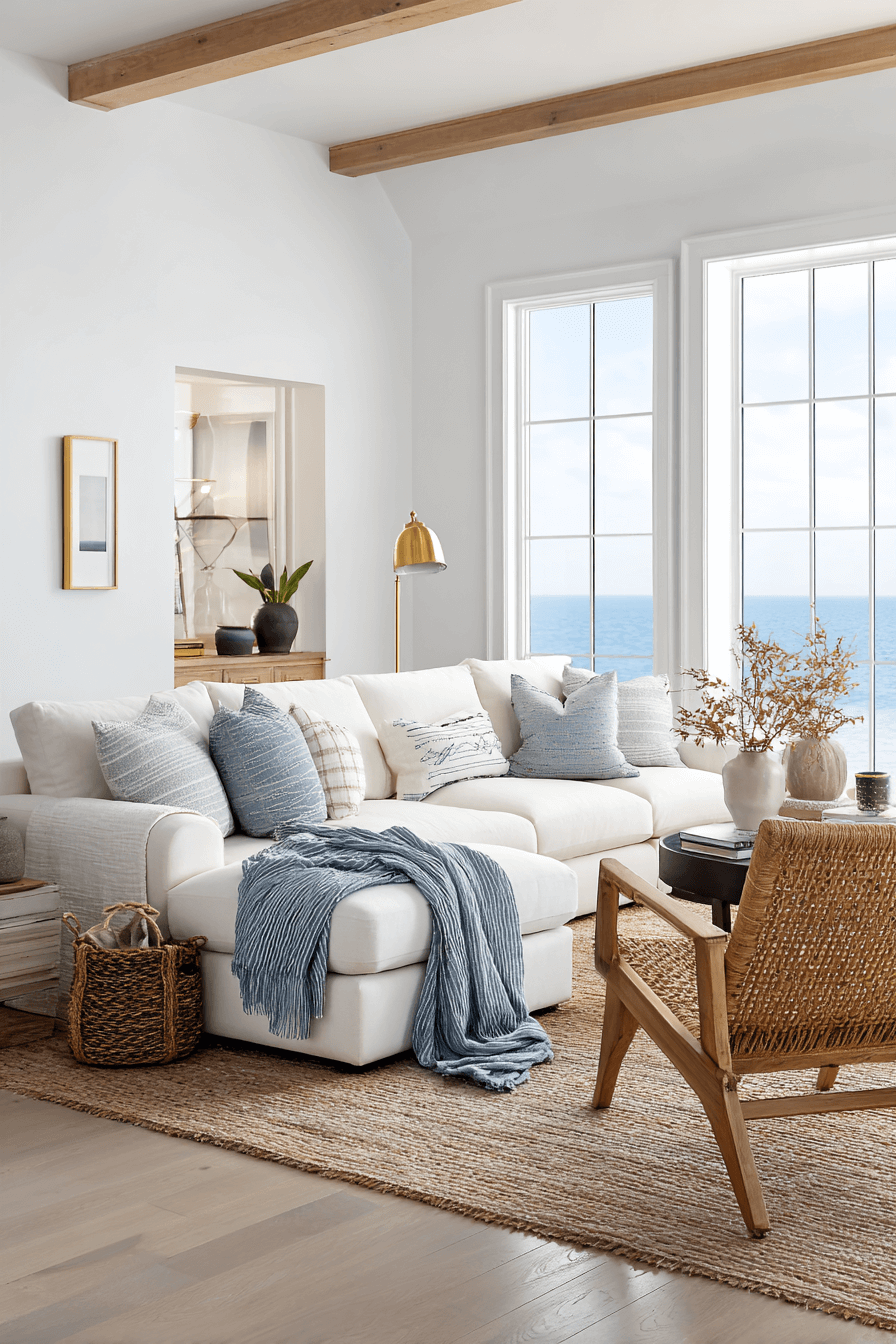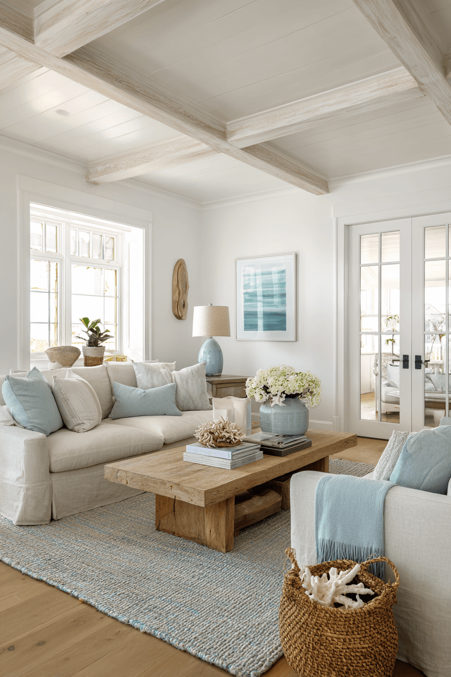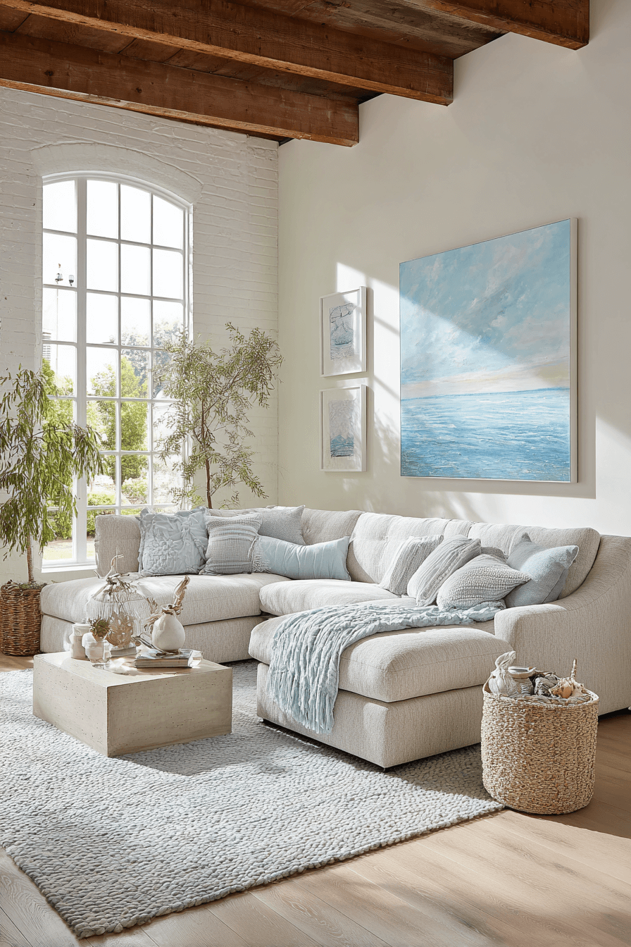 A tide-inspired sanctuary wraps beach house decor in soothing neutrals and soft blues. Layer cozy textiles with simple furnishings for ultimate relaxation. This style transforms beach house decor into a peaceful escape. Keep décor meaningful but minimal. Let natural light take center stage. Click to create your own calm coastal haven.