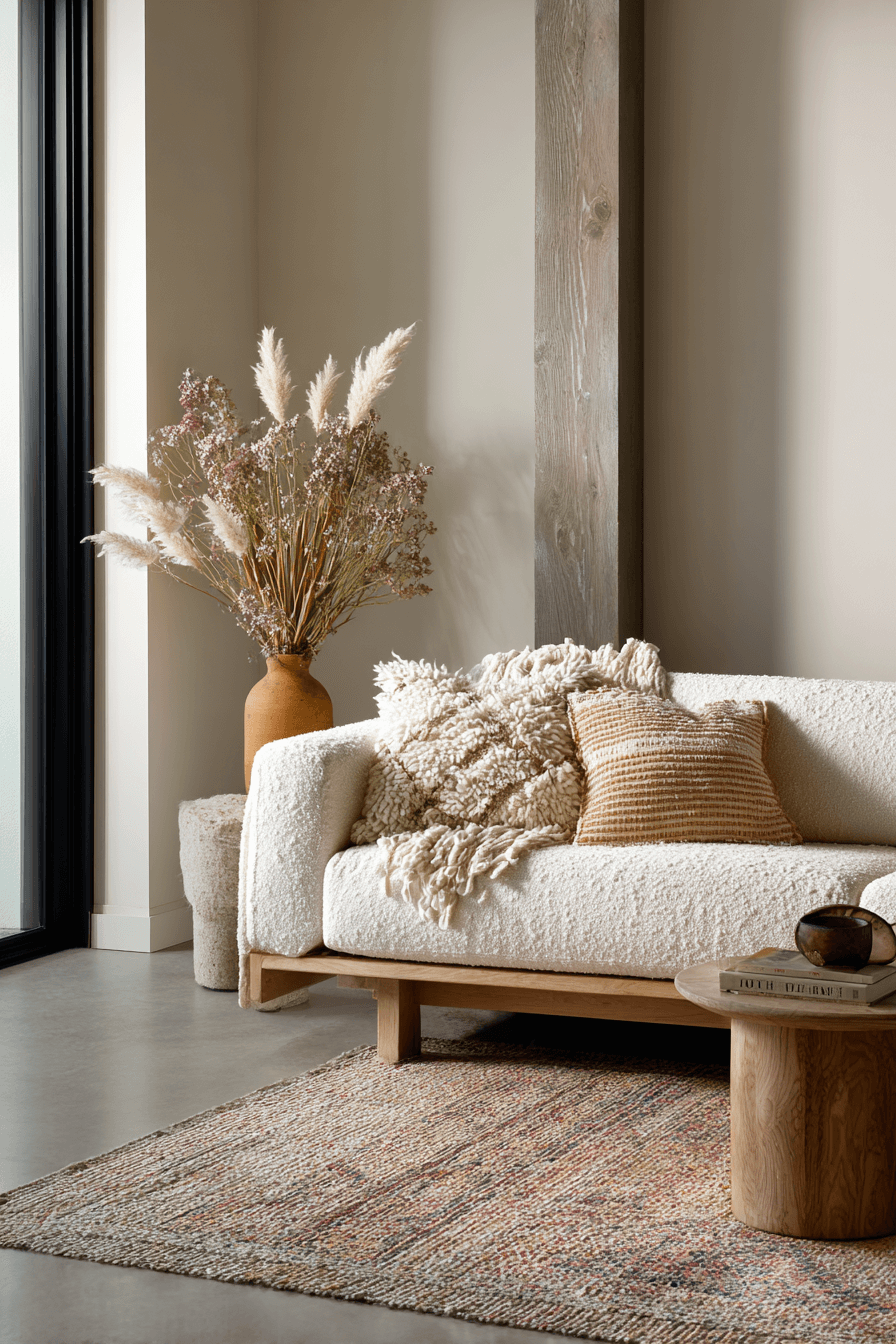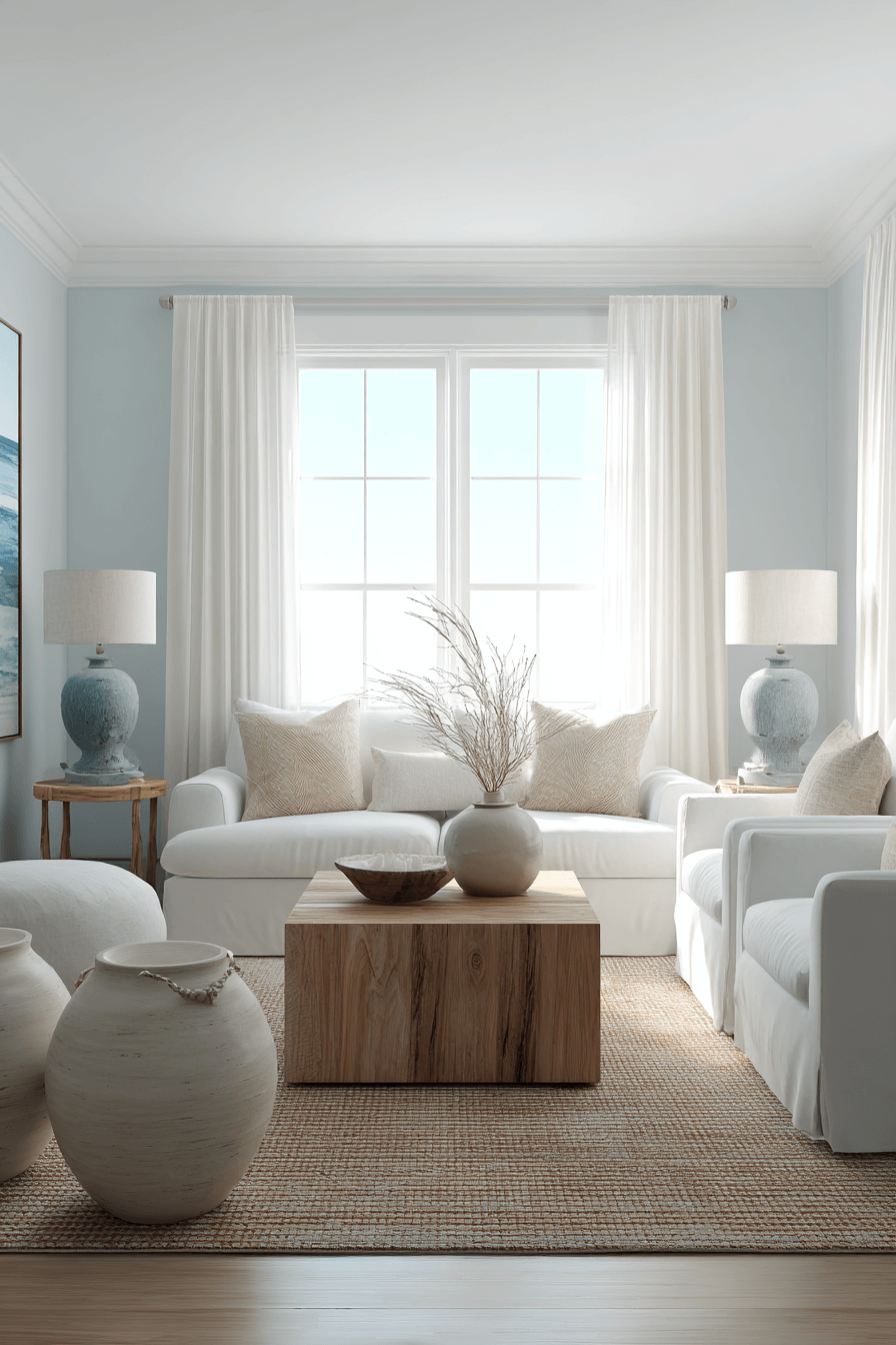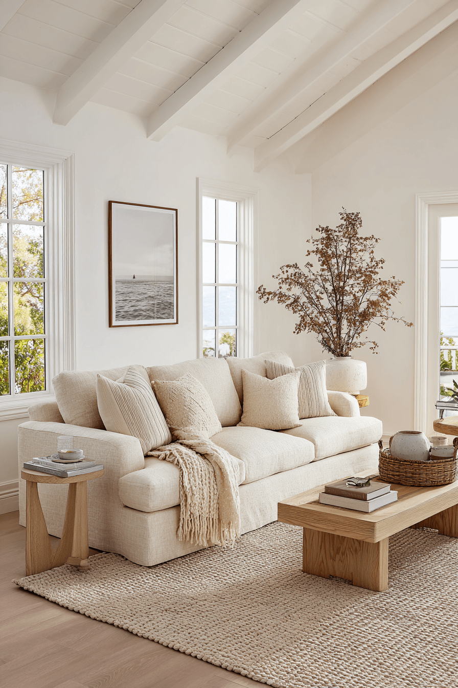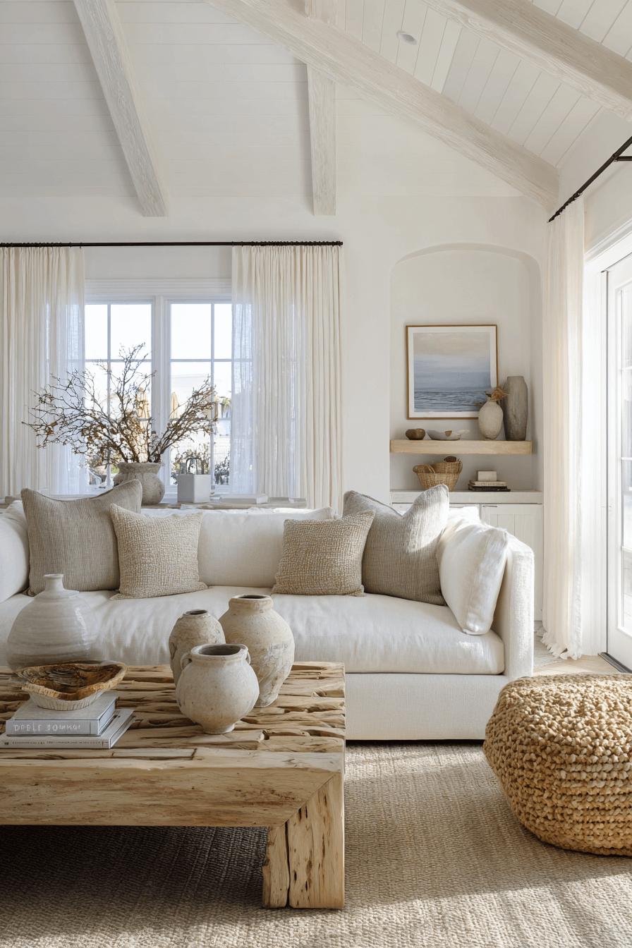 A tide-inspired sanctuary wraps beach house decor in soothing neutrals and soft blues. Layer cozy textiles with simple furnishings for ultimate relaxation. This style transforms beach house decor into a peaceful escape. Keep décor meaningful but minimal. Let natural light take center stage. Click to create your own calm coastal haven.