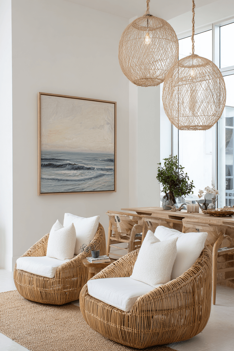 Rattan and rope elements weave natural craftsmanship into beach house decor. Woven pendant lights, rope-framed mirrors, and textured accent chairs feel airy and light. These materials align seamlessly with relaxed coastal living. They introduce depth without heaviness. Pair with soft fabrics and pale hues for cohesion. Tap to layer coastal texture into your space effortlessly.