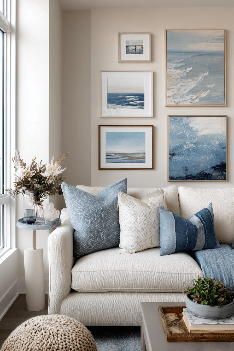 A coastal-inspired gallery wall adds story and personality to beach house decor. Framed seascapes, abstract ocean art, and beach photography create depth without clutter. Consistent frames maintain cohesion. Balanced layouts keep the look curated. This approach reflects the beauty of surrounding scenery. Tap to create a gallery wall that captures coastal memories.