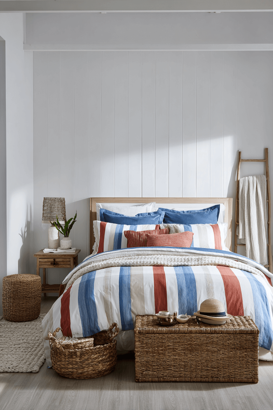 Cabana-style stripes inject playful resort energy into beach house decor. Cushions, rugs, or bedding with striped patterns echo umbrellas and loungers. The structured pattern pairs beautifully with relaxed textures. Keep colors coastal with blues and whites. Balance stripes with solids for harmony. Click to bring lively cabana vibes into your beach house decor.
