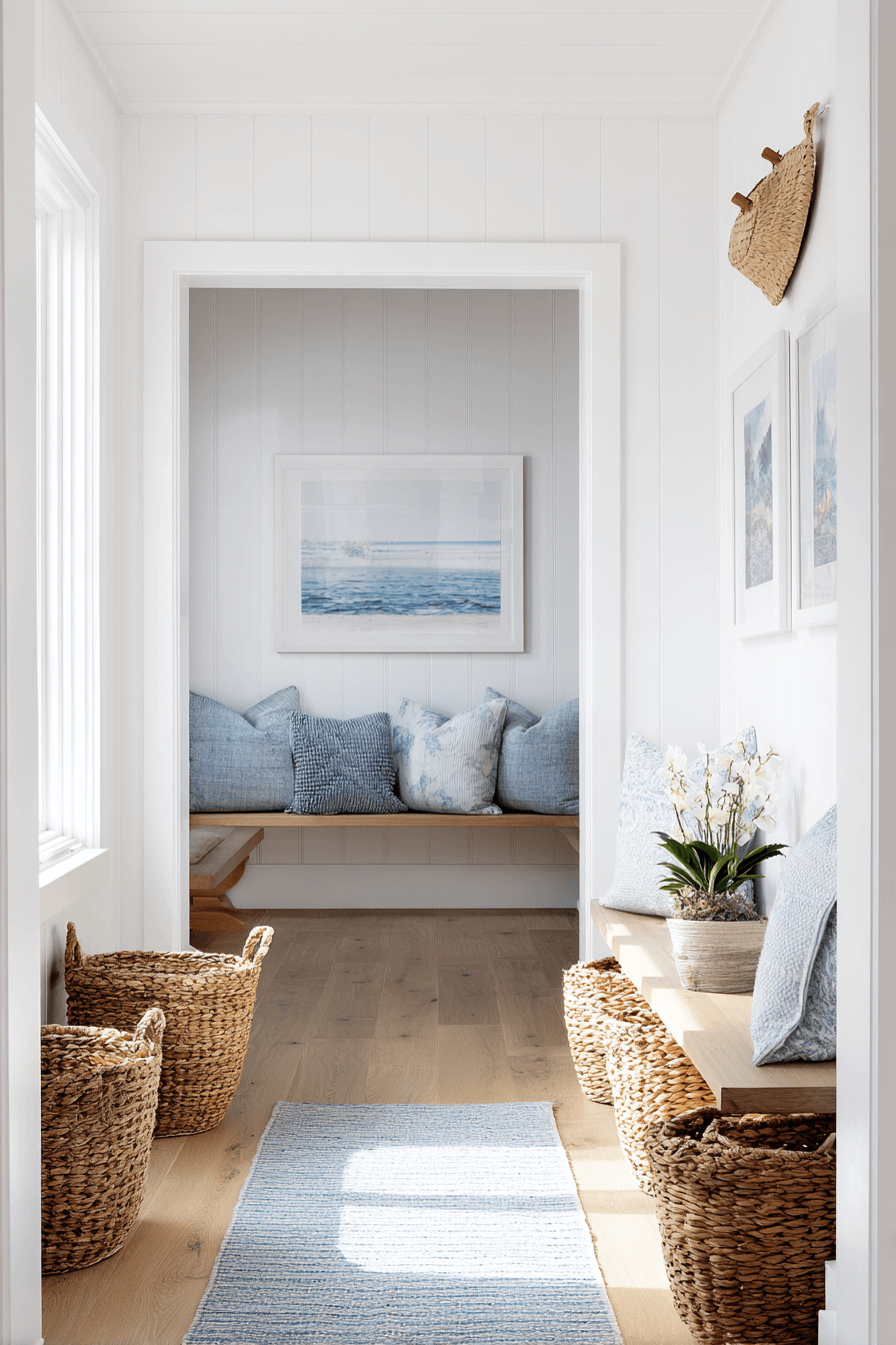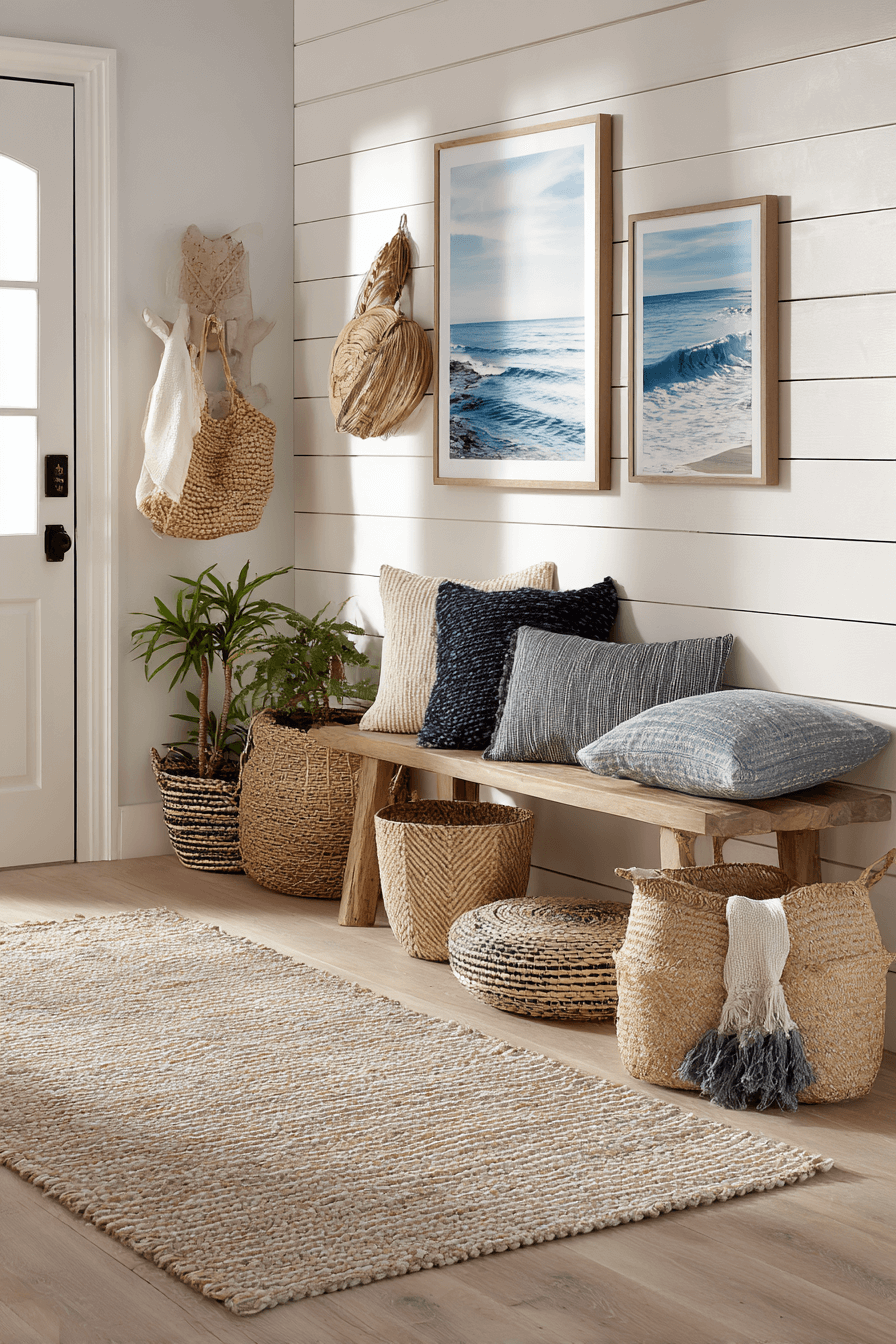 A welcoming entryway sets the tone for inviting beach house decor. Light wood benches, woven baskets, and soft blue accents greet guests with warmth. Functional elements like hooks blend seamlessly into the design. Keep the space open and clutter-free. Subtle coastal art adds personality. Click to refresh your entry with effortless seaside charm.