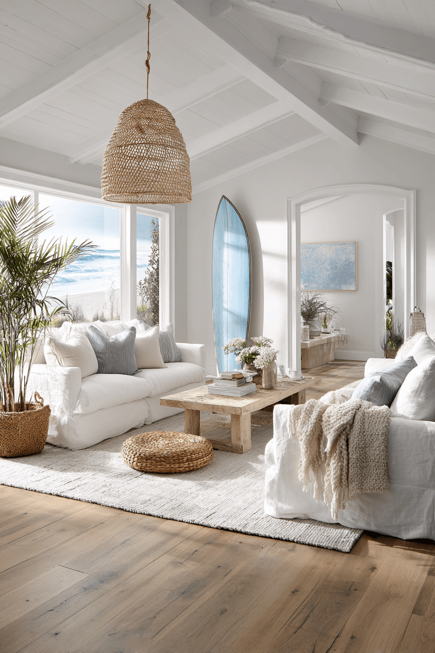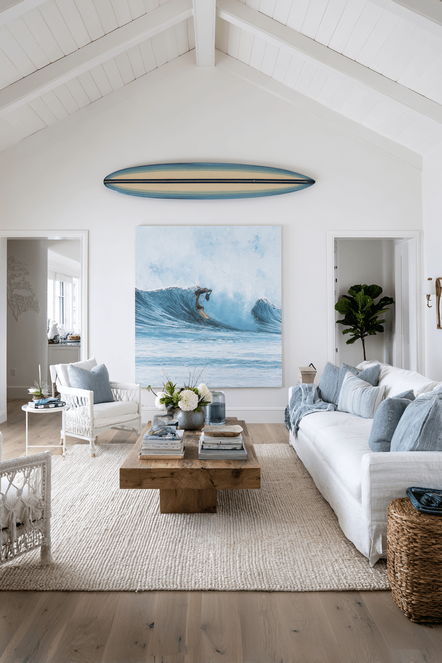 A sun-drenched surf lounge captures laid-back coastal energy within inviting beach house decor. Oversized seating, natural fibers, and generous sunlight create warmth and comfort. Displayed surfboards double as lifestyle art without adding clutter. This approach works because beach house decor often reflects casual seaside living. Keep the layout open and welcoming. Click to design your own relaxed surf-inspired retreat.