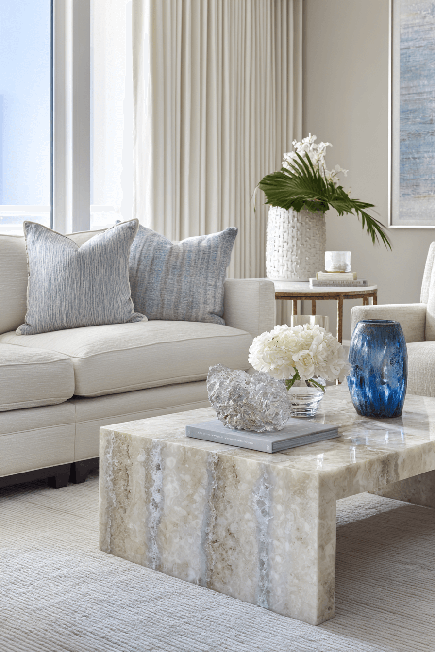 Stone accents introduce grounding contrast into beach house decor. Textured vases, stone tables, or gray feature walls mirror coastal cliffs. The natural material balances lighter fabrics beautifully. This contrast keeps beach house decor from feeling flat. Maintain a cohesive palette for an airy finish. Tap to add earthy balance to your coastal interior.