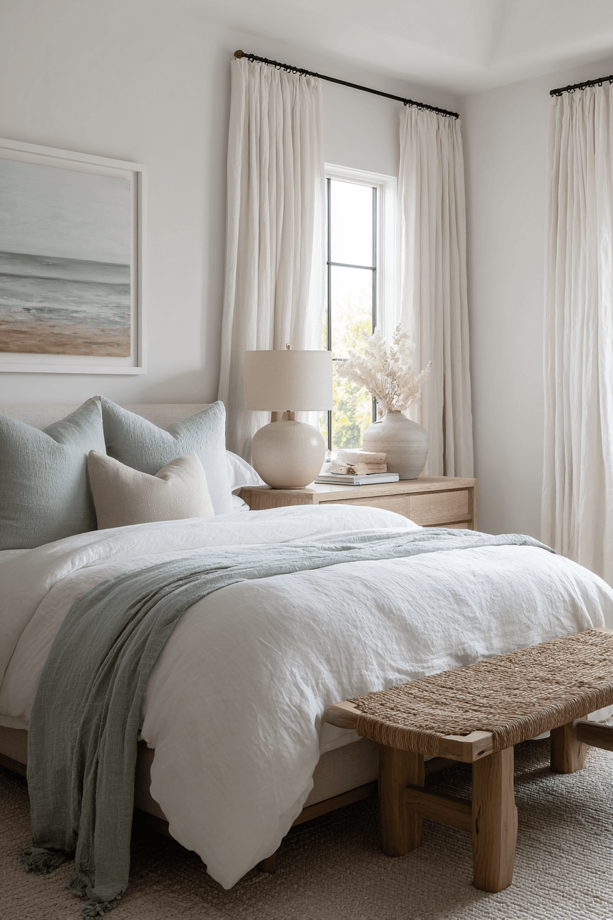 Minimalist coastal design lets beach house decor breathe. Clean-lined furniture, open layouts, and restrained palettes keep the focus on light and space. This style works because beach house decor shines brightest when it feels uncluttered and connected to the outdoors. Sheer curtains and subtle blue accents enhance the airy vibe. Keep décor intentional and thoughtfully spaced. Click to embrace coastal simplicity at its most refined.