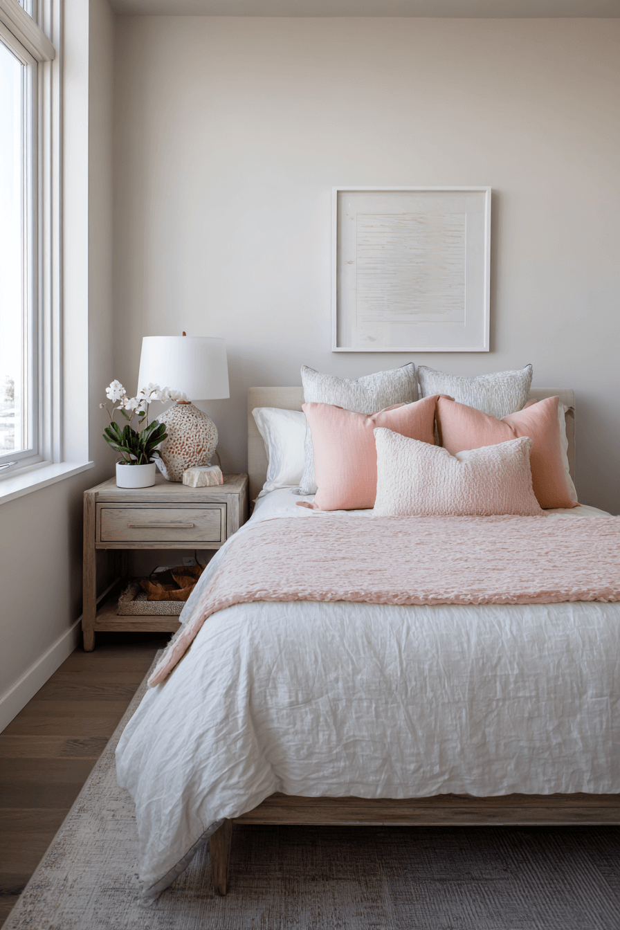 Soft coral highlights introduce gentle warmth into balanced beach house decor. The muted pink tone pairs effortlessly with sandy neutrals and ocean blues. Used sparingly, it creates subtle contrast. Incorporate coral through pillows or art for impact. Maintain a calm base palette. Tap to warm up your beach house decor with coastal color.