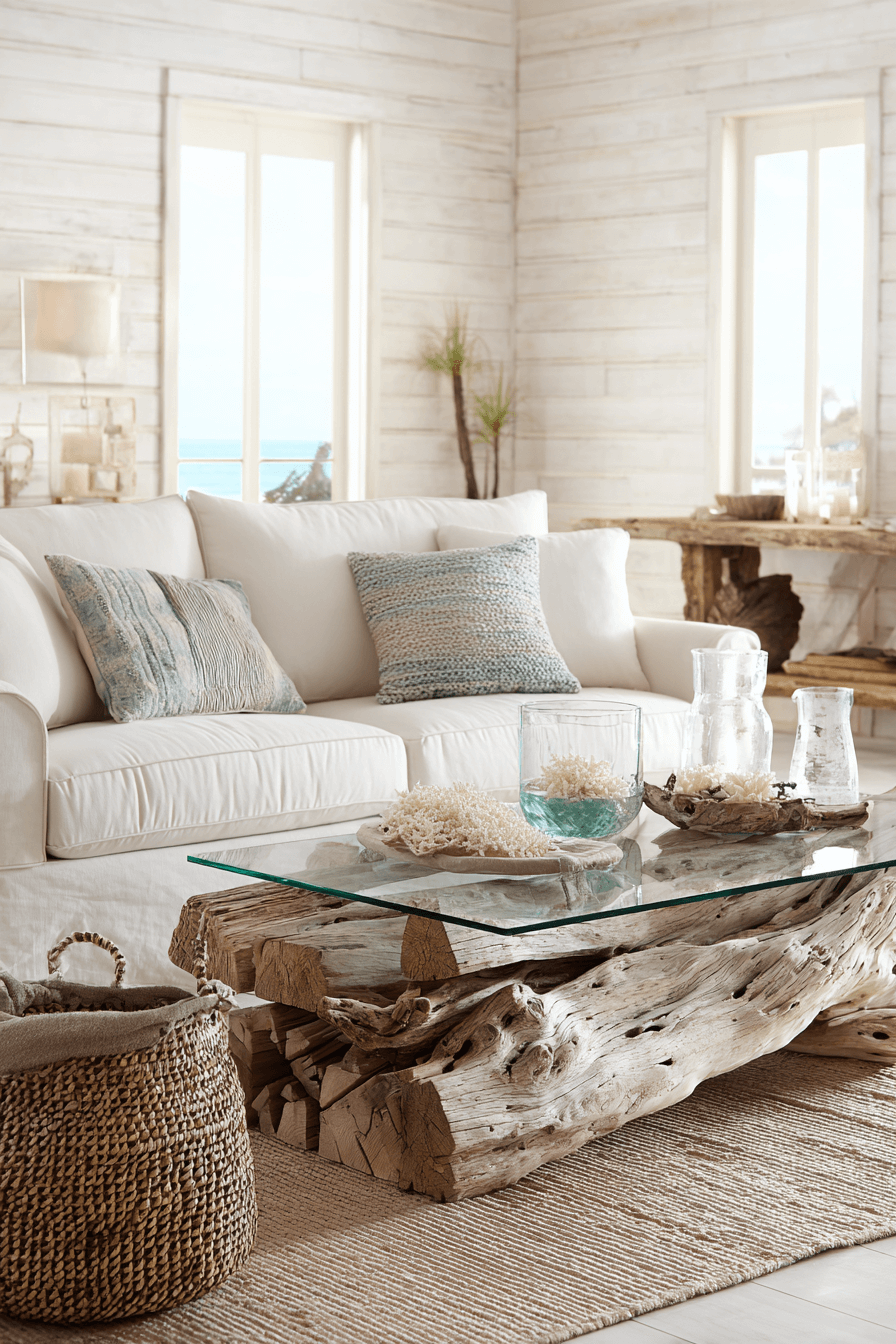 Driftwood accents introduce organic texture and sculptural beauty into beach house decor. A reclaimed coffee table or weathered picture frames ground the room in nature. The worn finish contrasts perfectly against crisp walls and breezy textiles. This works because beach house decor celebrates materials shaped by wind and sea. Keep the layout simple so the natural textures stand out. Click to add rustic coastal charm with ease.