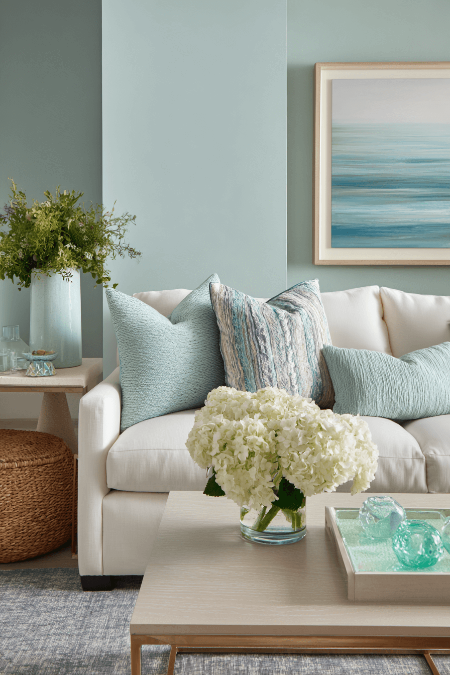 Soft horizon blues mimic the meeting of sea and sky in serene beach house decor. Pale blues layered with crisp white create a tranquil atmosphere. This palette reflects coastal surroundings effortlessly. Add gentle gradients through pillows or artwork for depth. Keep furniture light and streamlined. Click to infuse your beach house decor with calming ocean tones.