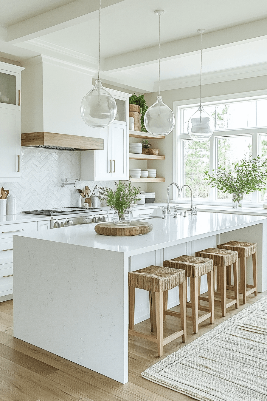 A luminous all-white design makes a beach house kitchen feel instantly open, fresh, and sun-drenched. Bright cabinetry reflects natural light, creating an airy atmosphere that feels expansive and calm. Pale wood floors add warmth so the space never feels stark. Large windows become part of the décor, letting ocean views shine. The overall look is timeless, clean, and endlessly versatile. Click to bring this radiant white coastal look into your home.