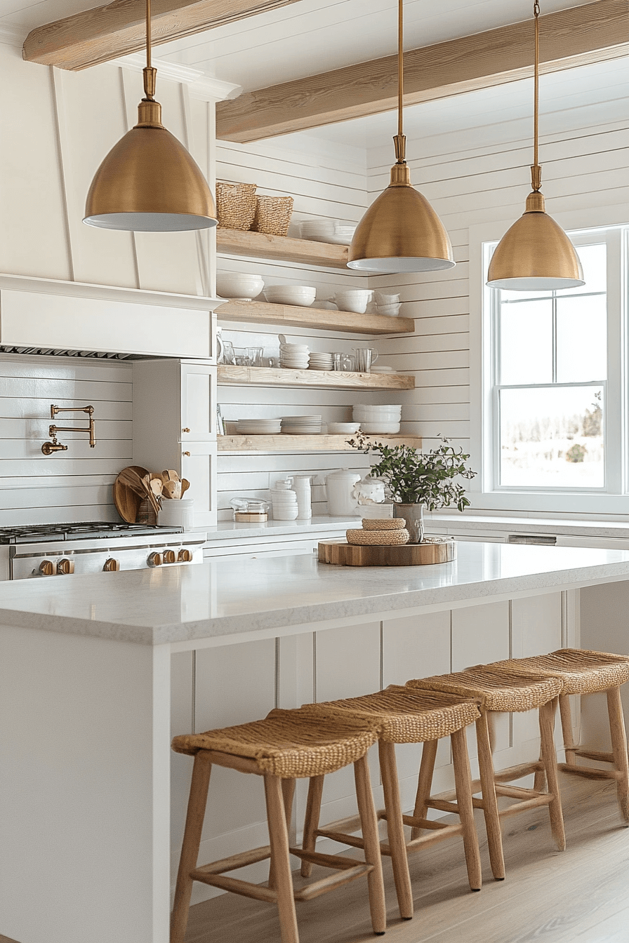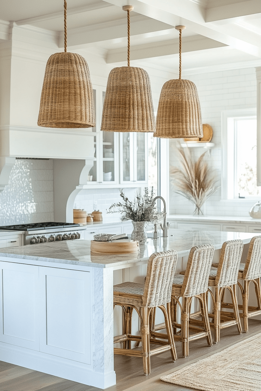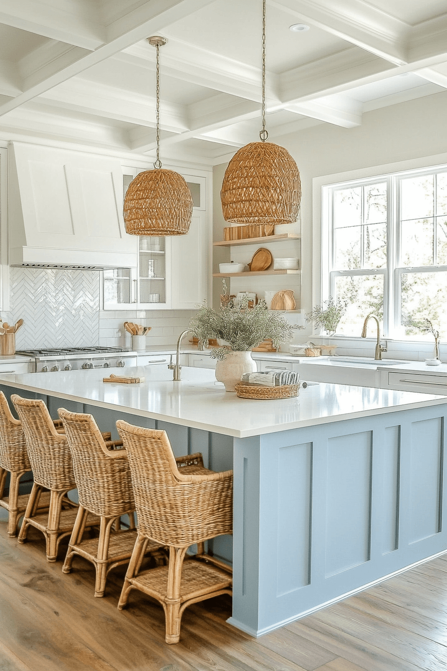 Layered rattan and woven textures add warmth to a relaxed beach house kitchen without clutter. White cabinetry keeps the base bright and balanced. Natural elements connect the space to its seaside surroundings. The layered look feels casual yet curated. It’s organic coastal style done beautifully. Tap to weave texture into your kitchen design.