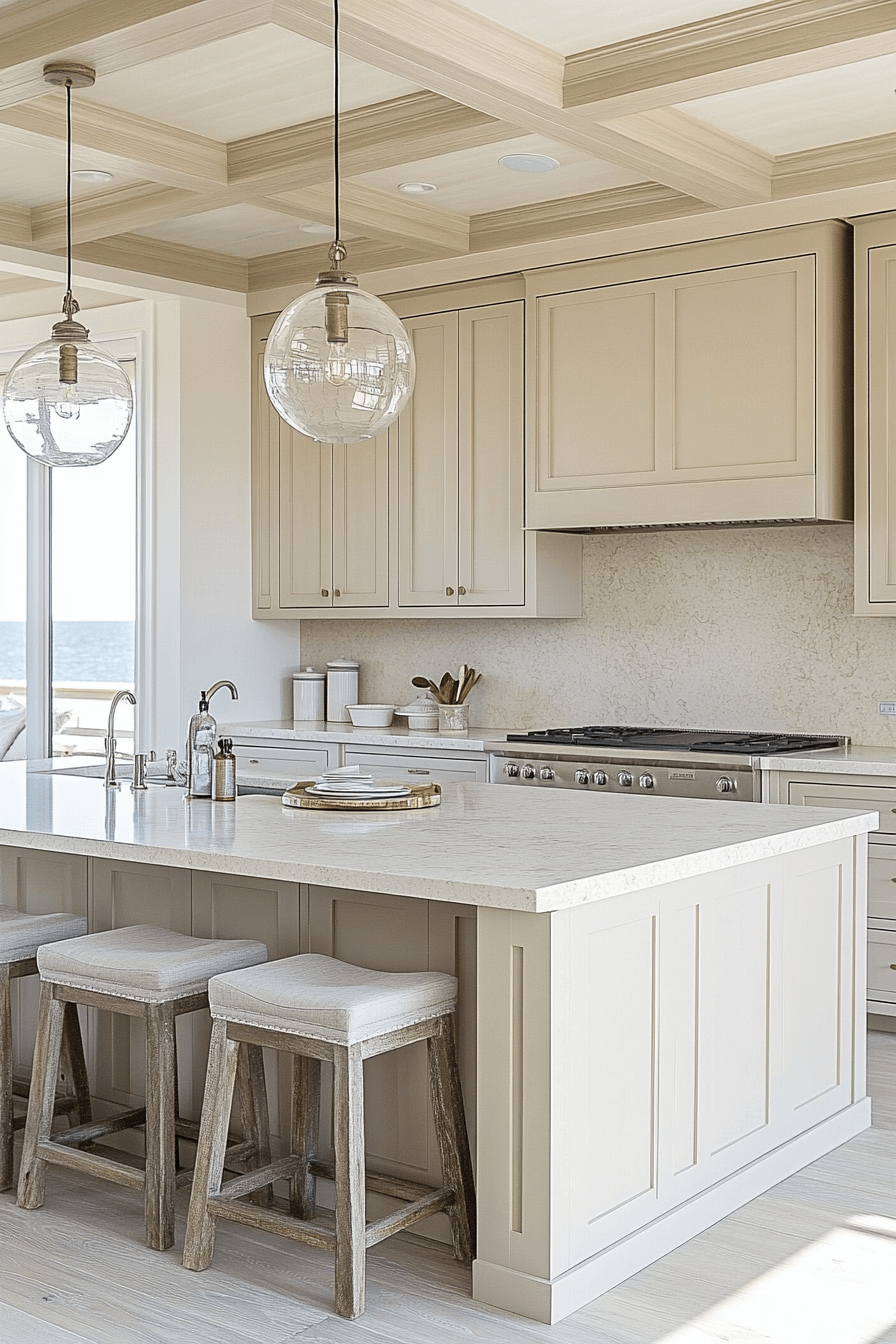 Warm sand-toned cabinetry introduces softness into a welcoming beach house kitchen. The creamy beige shade offers a natural alternative to stark white. Paired with simple hardware and light countertops, the look stays modern. The warmth creates an inviting, sun-kissed feel. It’s subtle but beautifully impactful. Tap to warm up your coastal kitchen.