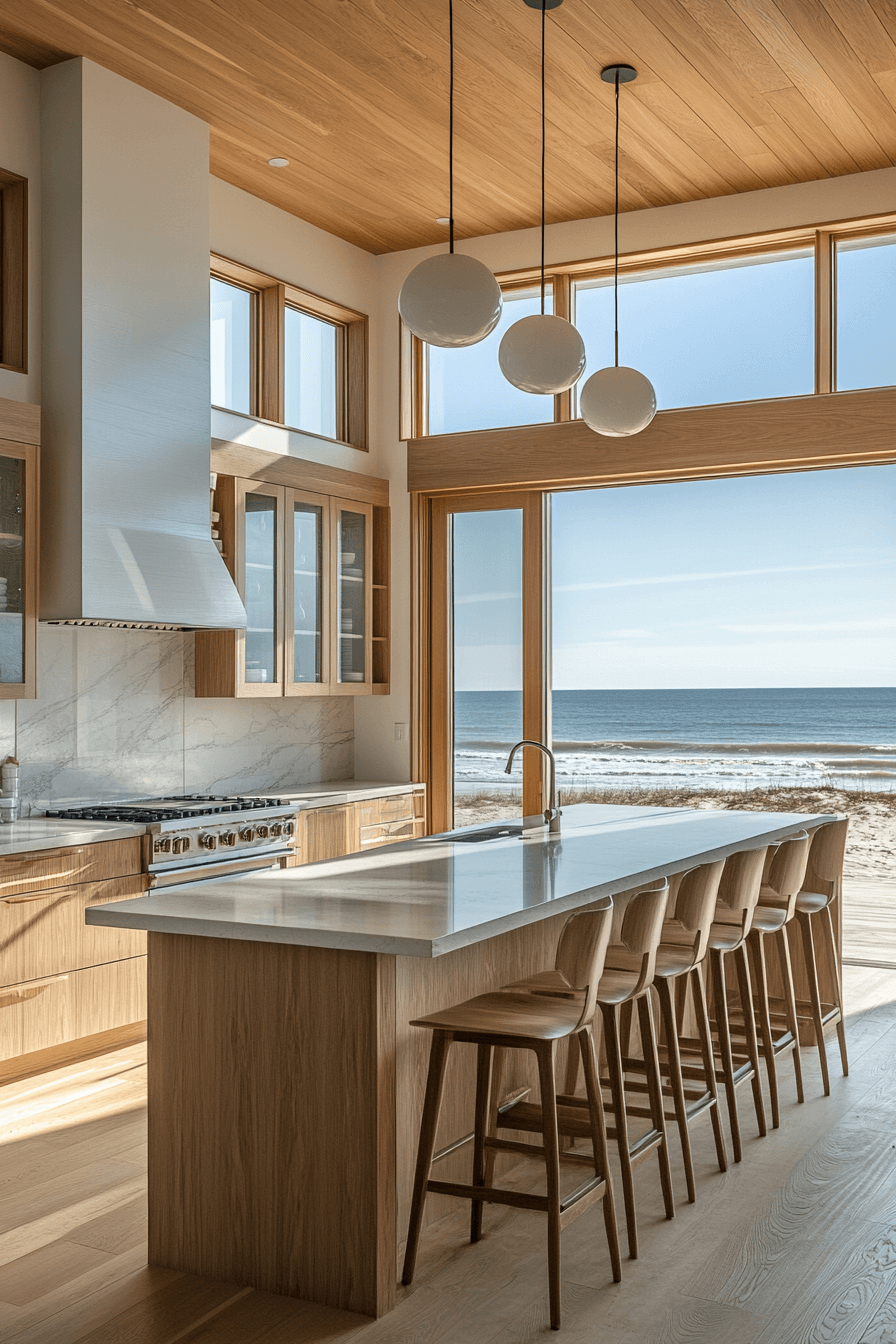 Clean architecture and expansive glass give a waterfront beach house kitchen modern sophistication. Minimal décor keeps the focus on light and scenery. Sleek cabinetry enhances the streamlined aesthetic. Soft coastal tones tie everything together beautifully. It feels current, calm, and intentional. Tap to design around your ocean view.