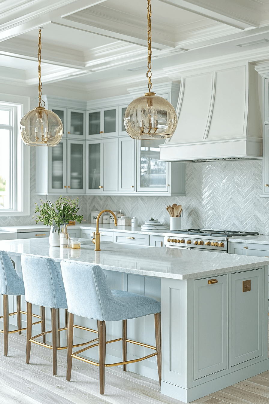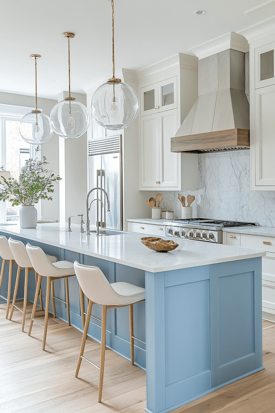 A pale blue peninsula adds personality to a charming beach house kitchen. The soft color contrasts gently with surrounding white cabinetry. It defines the space while keeping the layout open. The hue feels playful yet polished. It’s a subtle statement that brightens the room. Click to explore this coastal accent idea.