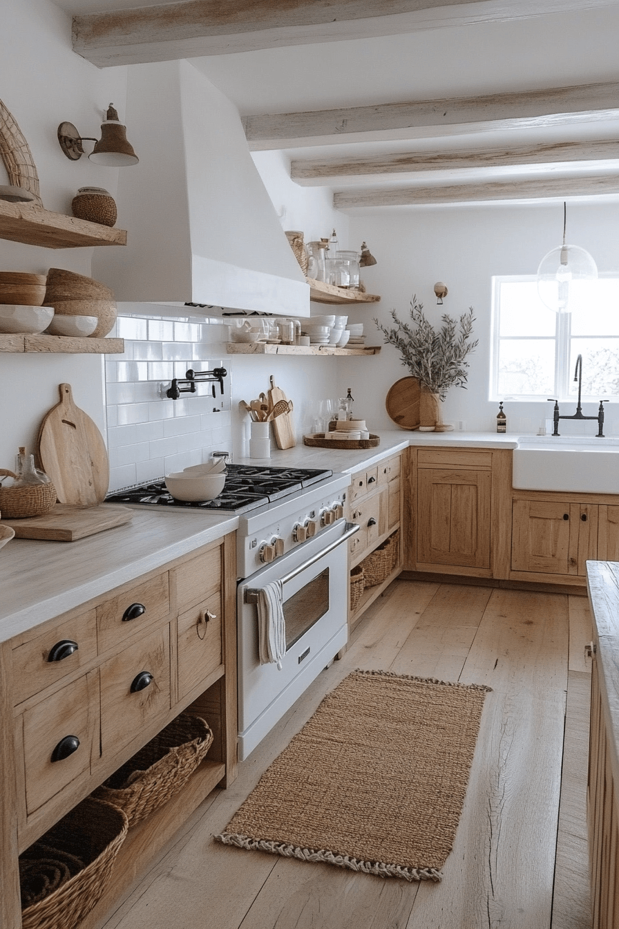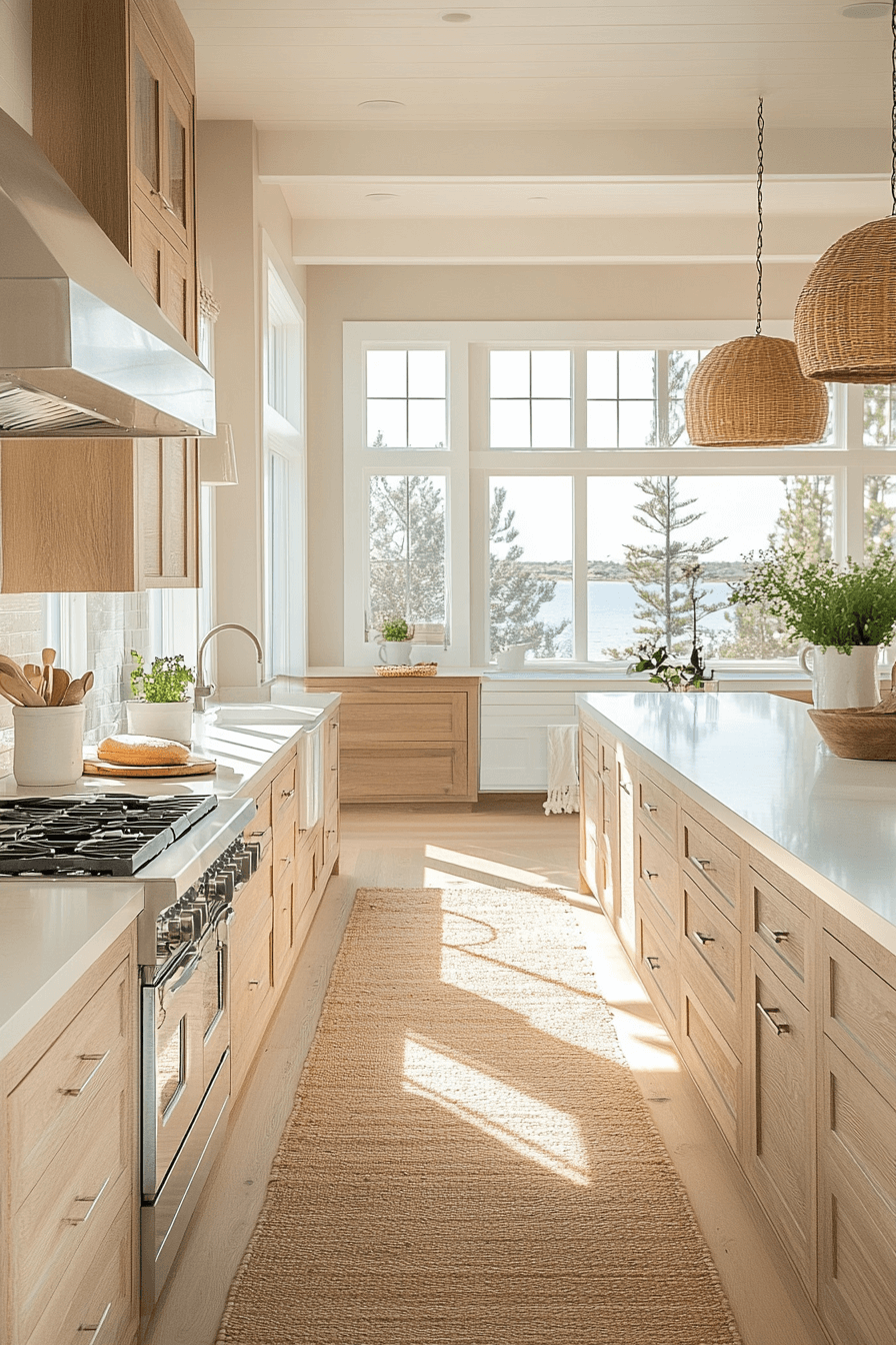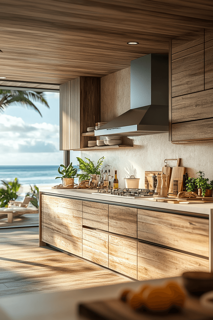 Scandinavian simplicity meets seaside warmth in a minimalist beach house kitchen. Pale wood cabinets and white surfaces create clarity and lightness. Clean lines maintain order and function. The restrained palette lets texture shine naturally. It feels calm, organized, and modern. Tap to blend Nordic minimalism with coastal ease.