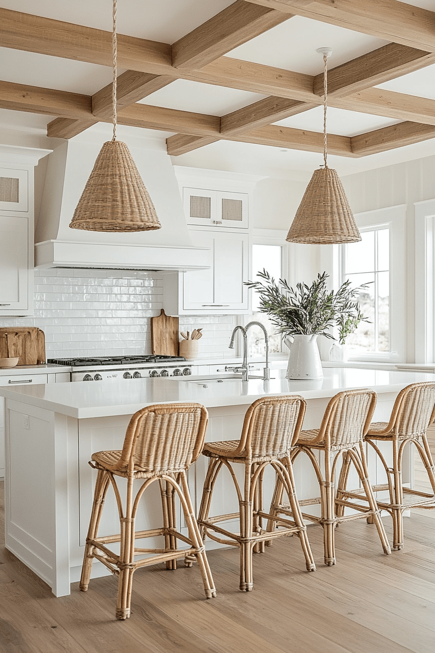 Crisp white cabinetry paired with rattan accents creates inviting warmth in a timeless beach house kitchen. The woven details add dimension and softness. Light surfaces maintain openness and brightness. The overall look feels clean yet cozy. It’s a classic coastal pairing that never fails. Tap to refresh your space with this airy blend.
