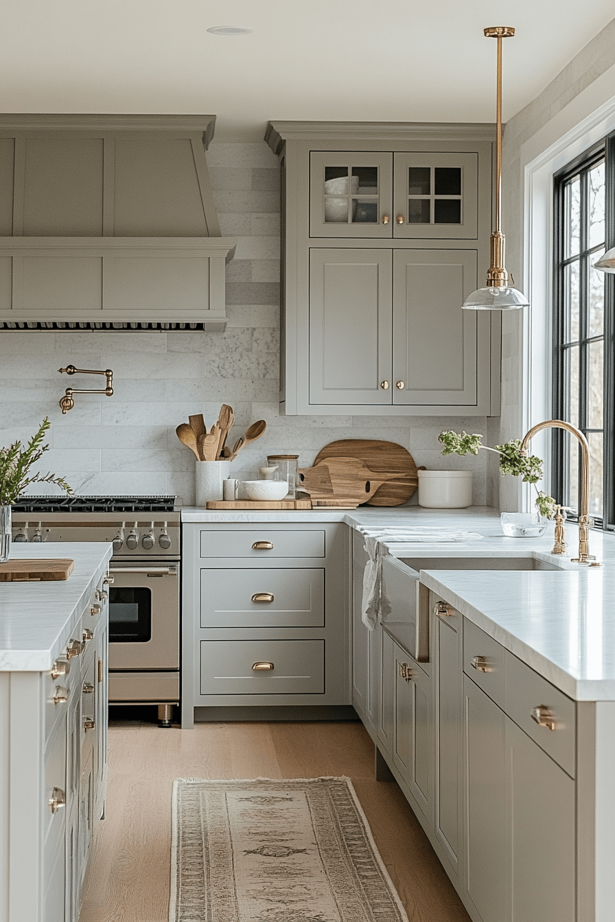 A muted seafoam palette introduces gentle personality into a stylish beach house kitchen. Soft green-blue cabinets feel refreshing yet sophisticated. Marble countertops and brushed brass accents elevate the look instantly. The color subtly reflects coastal waters without dominating the space. It’s polished, playful, and beautifully refined. Click to bring this ocean-inspired shade home.