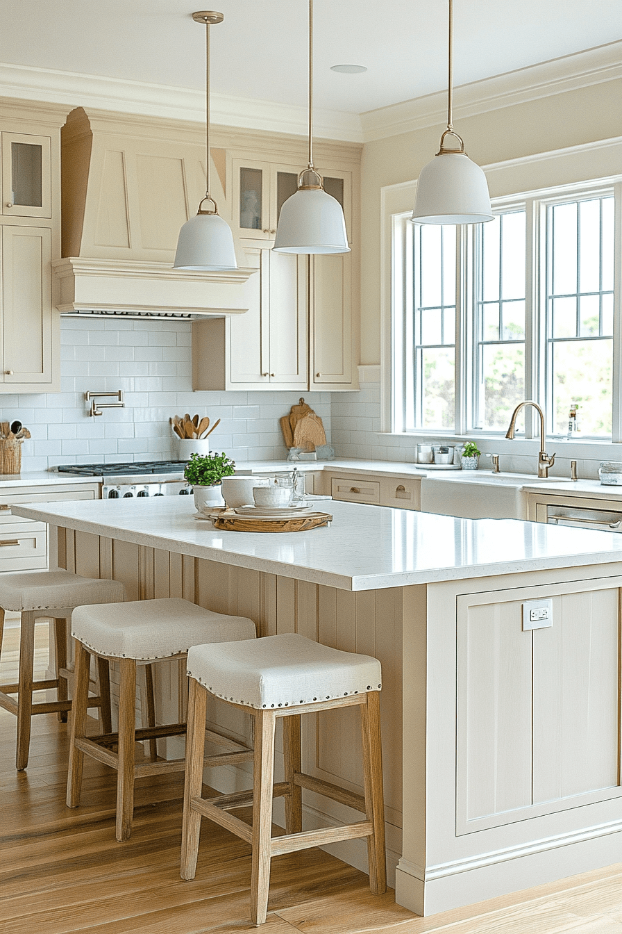 Soft neutral layering creates a calm and cohesive beach house kitchen grounded in creamy whites and warm taupes. The subtle palette highlights architectural details and natural light. Statement lighting stands out beautifully against the restrained backdrop. The space feels serene and elevated. It’s understated coastal elegance at its finest. Tap to explore this tranquil seaside style.