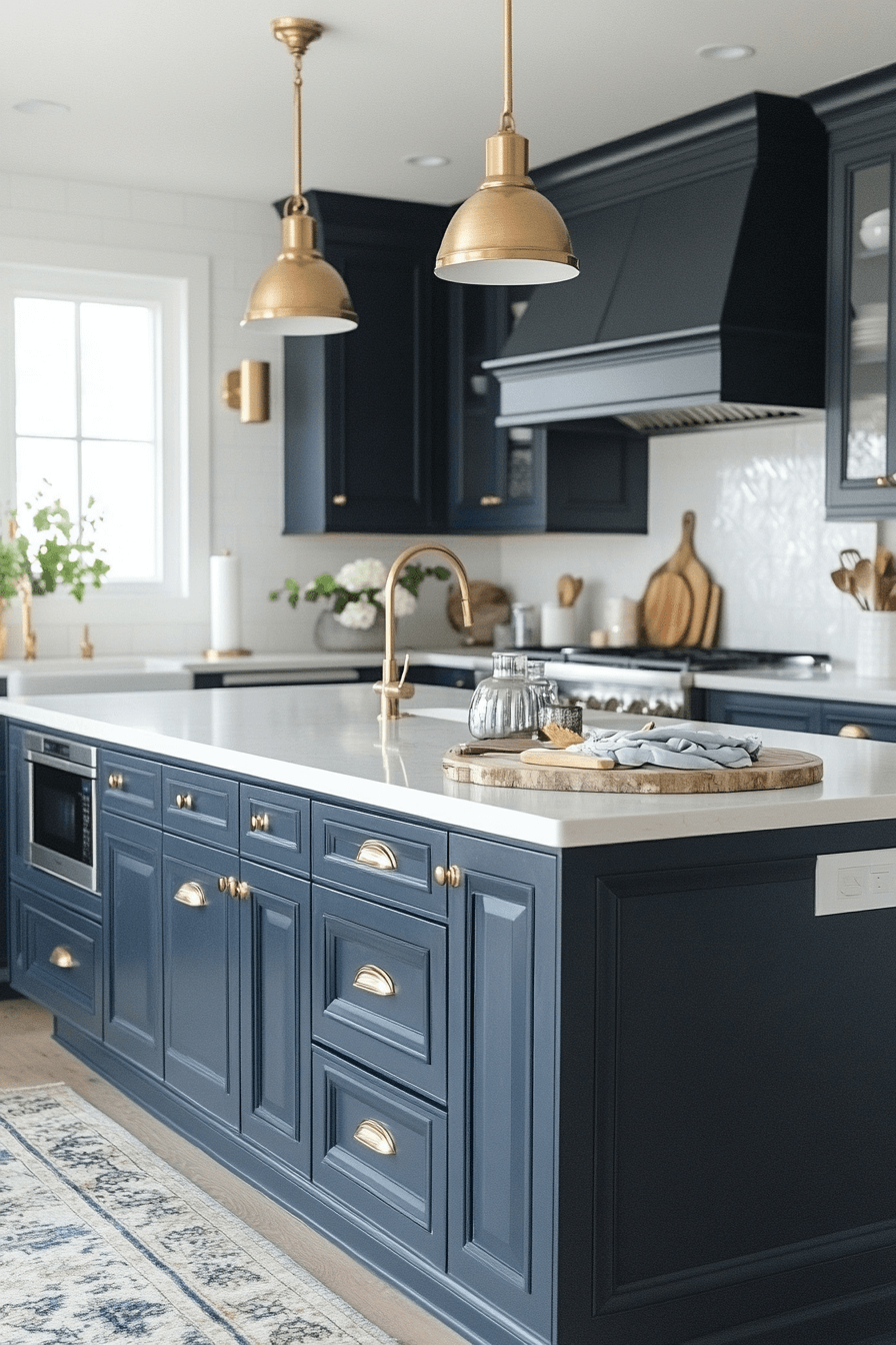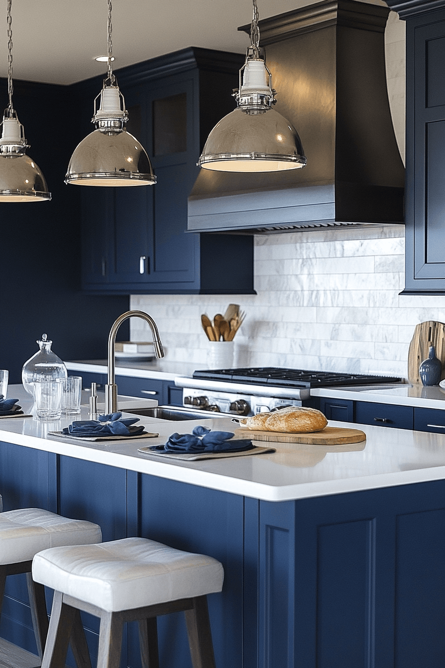 Deep navy paired with crisp white creates striking contrast inside a modern beach house kitchen. Lower navy cabinets ground the space while white uppers keep it airy. Clean hardware and contemporary lighting prevent the look from feeling themed. The bold color feels timeless and confident. It’s maritime charm with a modern edge. Tap to anchor your space with navy sophistication.