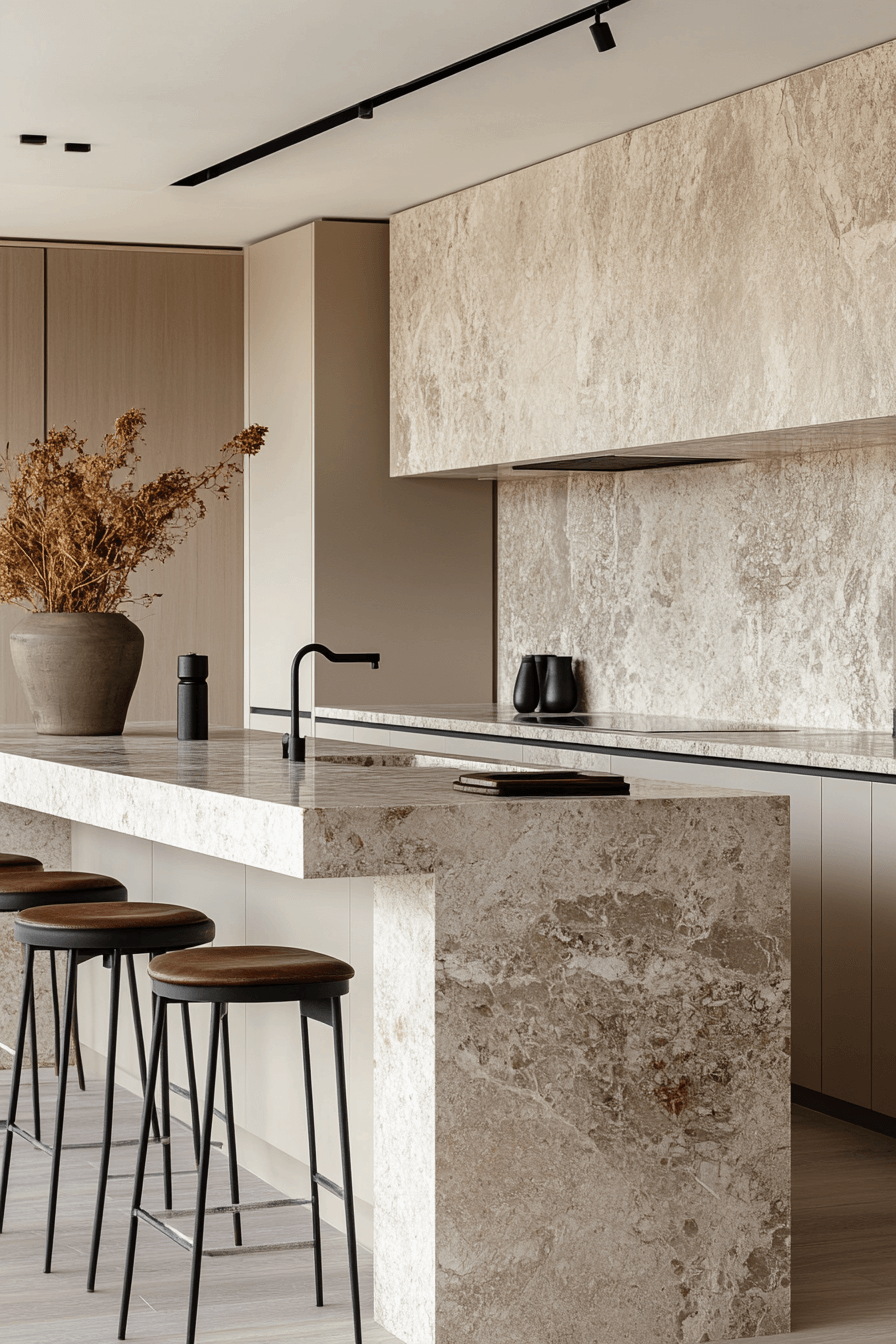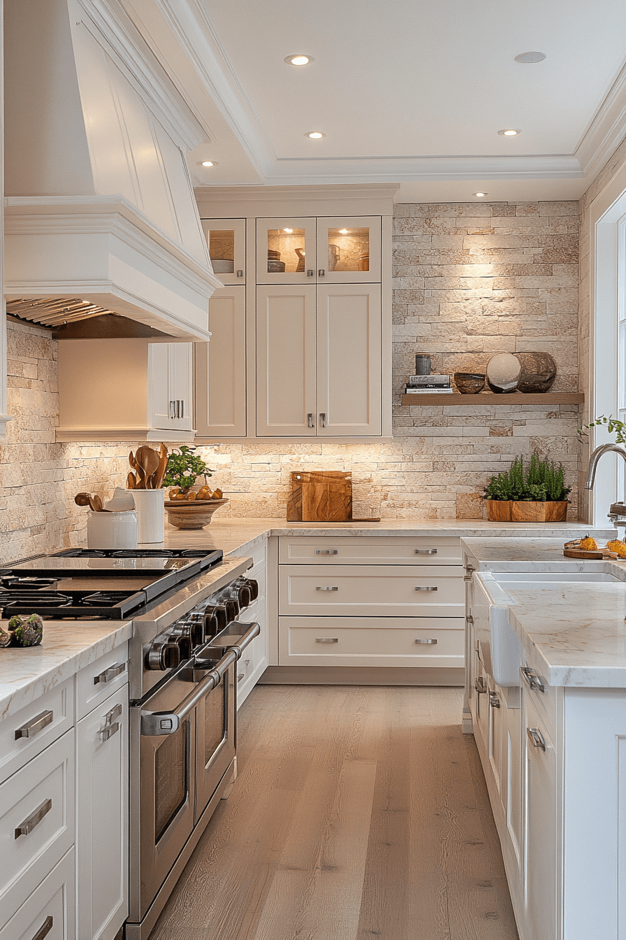 Textured stone backsplashes add natural character to an elevated beach house kitchen. The organic surface becomes a subtle focal point. Light cabinetry keeps the look balanced. The mix of raw and refined elements feels grounded and sophisticated. It’s coastal texture at its best. Tap to transform your kitchen with stone detail.