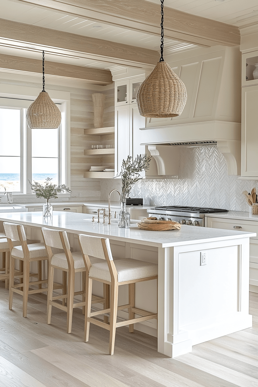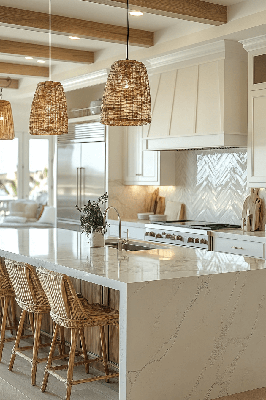 Soft boho layering introduces personality into a creative beach house kitchen. Woven pendants and subtle patterned tiles add visual interest. Neutral foundations prevent the look from feeling busy. The mix of relaxed and refined elements feels fresh and inviting. It’s coastal with a touch of artistry. Click to bring boho flair into your seaside kitchen.