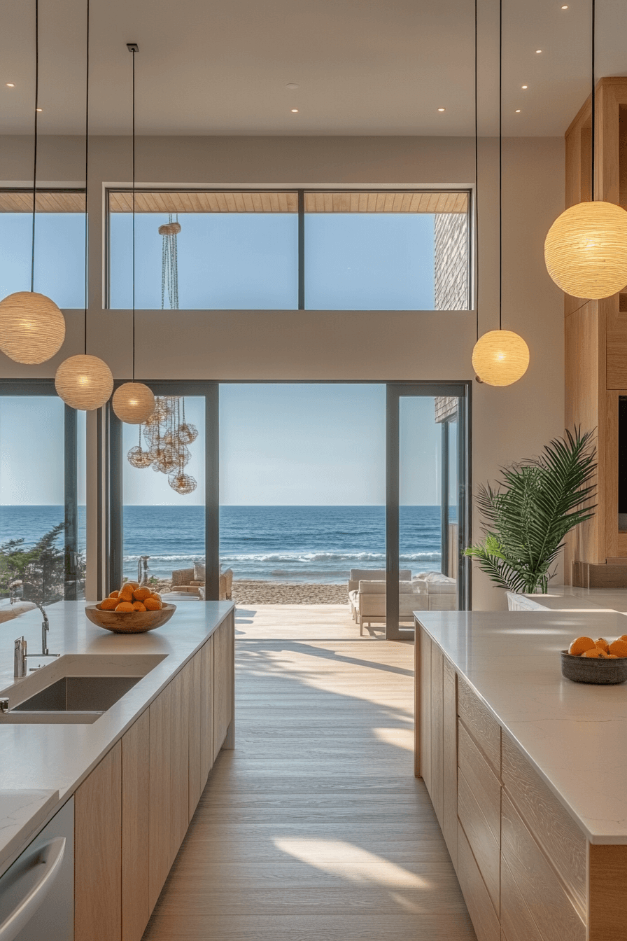 An open-concept layout transforms a beach house kitchen into a light-filled gathering hub. Expansive windows blur the boundary between indoors and out. Reflective surfaces amplify sunlight throughout the room. The generous flow makes cooking and entertaining effortless. It feels welcoming, spacious, and perfectly suited to coastal living. Click to design your kitchen around the view.