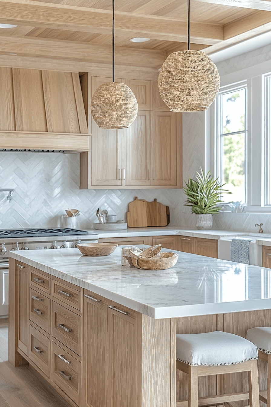 Light oak cabinetry brings warmth and softness into a serene beach house kitchen. The pale wood echoes sandy boardwalks and weathered driftwood. Paired with white walls and subtle blue accents, the result feels balanced and breezy. The natural tone adds character without overpowering the room. It’s modern coastal charm done right. Tap to warm up your seaside kitchen.