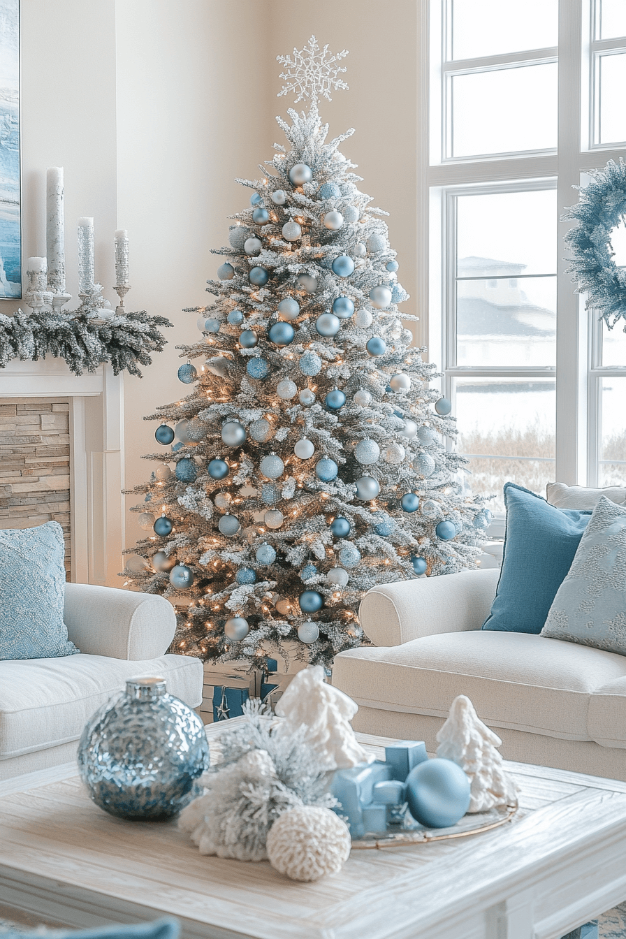 Soft blue tones and airy whites create a calming coastal mood that refreshes your holiday living room with gentle seasonal charm. Woven textures, driftwood décor, and pale-blue accents bring a breezy seaside feeling into the space. A frosted tree decorated in silver and cool blue ornaments adds a peaceful glow. The entire look feels soothing, inviting, and wonderfully wintry.