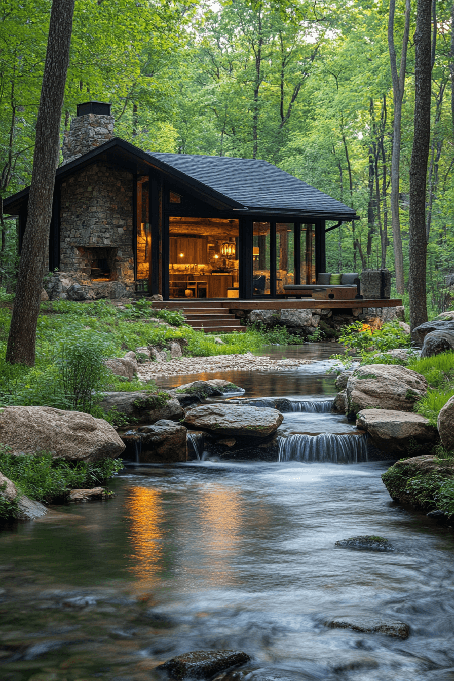Flowing water, serene hues, and organic materials shape cabin interiors that echo the calm of a nearby stream. Outdoor spaces make it easy to enjoy the soothing sounds. Perfect for those who crave peace.