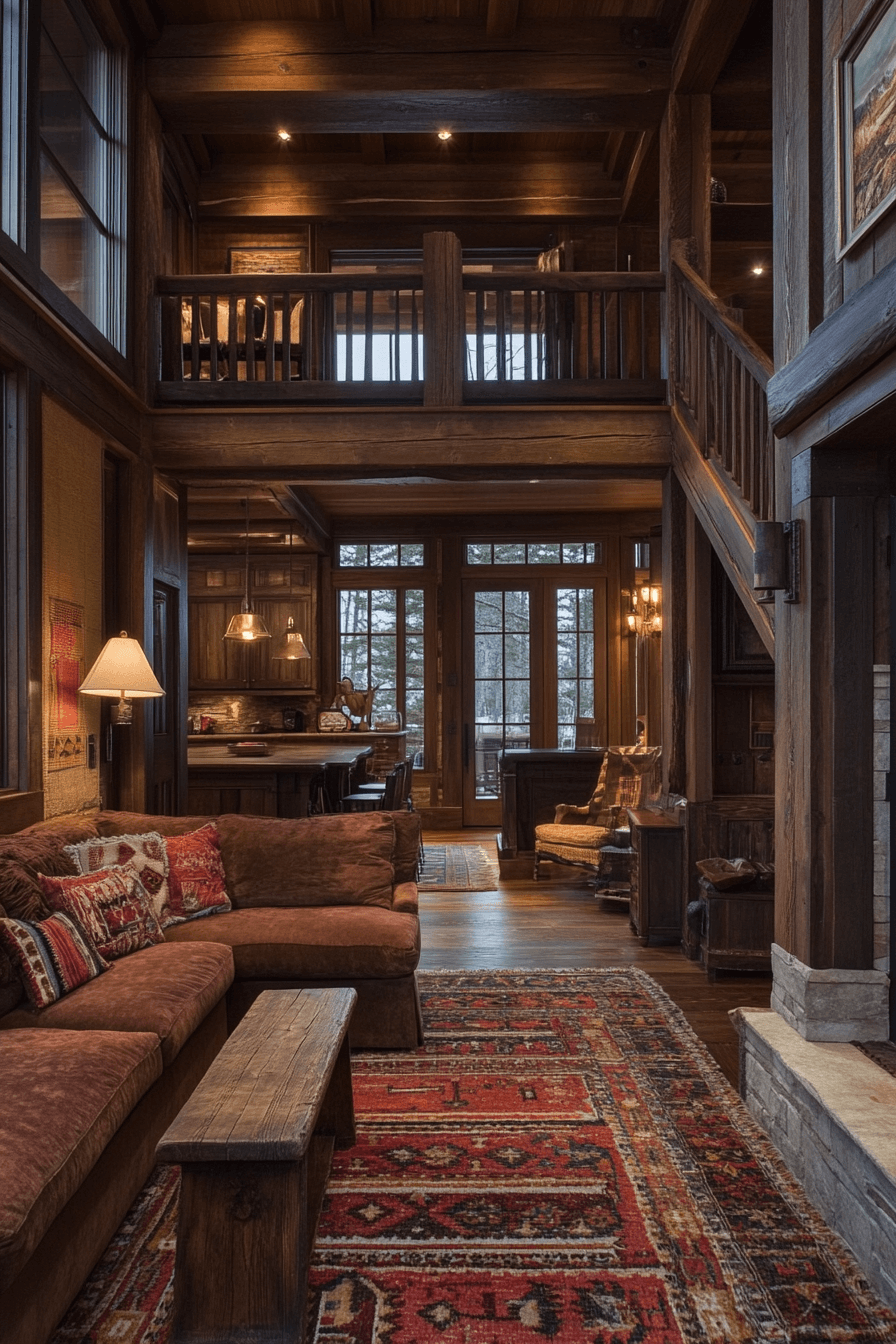 Exposed beams, wood-paneled walls, and handcrafted details bring enduring character to cabin interiors. Traditional patterns and rustic decor reinforce a sense of history. This style is all about keeping the classic cabin spirit alive.