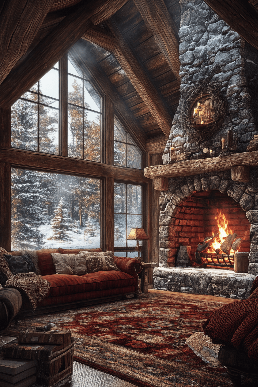Layers of cozy fabrics, deep wood tones, and softly glowing light transform cabin interiors into havens from winter’s chill. Every detail invites you to curl up and enjoy the warmth. This style makes cold days feel comforting and inviting.