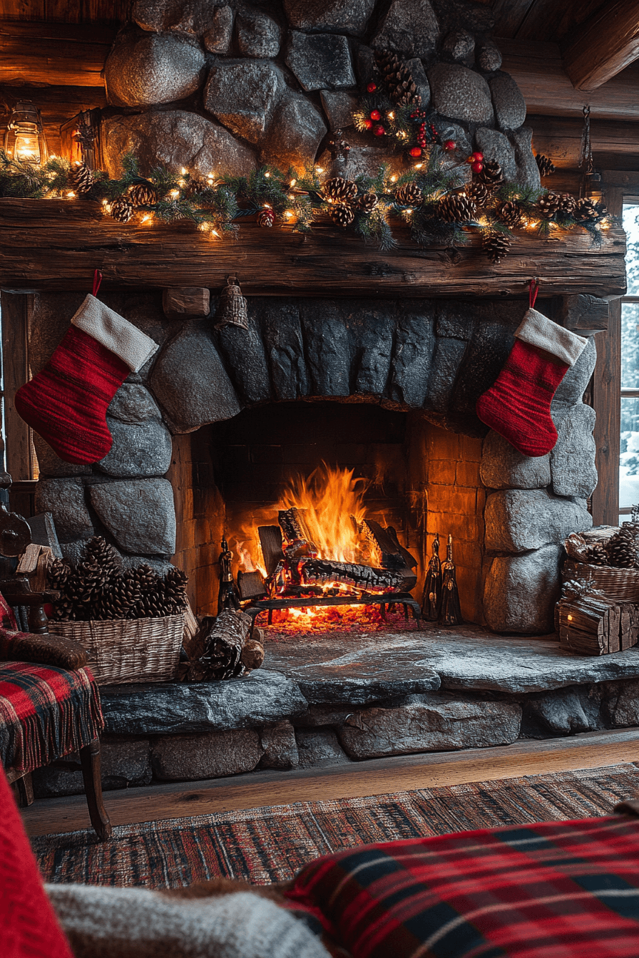 Natural textures instantly bring a grounding warmth to your christmas fireplace decor. Pinecones, wooden garlands, and rustic ornaments pair beautifully with the fire’s gentle glow. Burlap stockings and twig accents complete the cozy, forest-inspired style. This nature-forward look delivers the charm of a woodland hideaway right to your mantel.