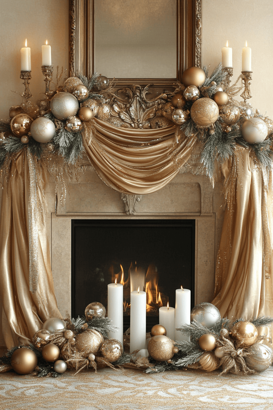 Metallic ornaments and tinsel add dramatic shine to your christmas fireplace decor. Gold, silver, and blue highlights reflect the firelight and create a dazzling focal point. The layered shimmer instantly elevates your room with bold holiday energy. This radiant style suits modern and glam spaces beautifully.