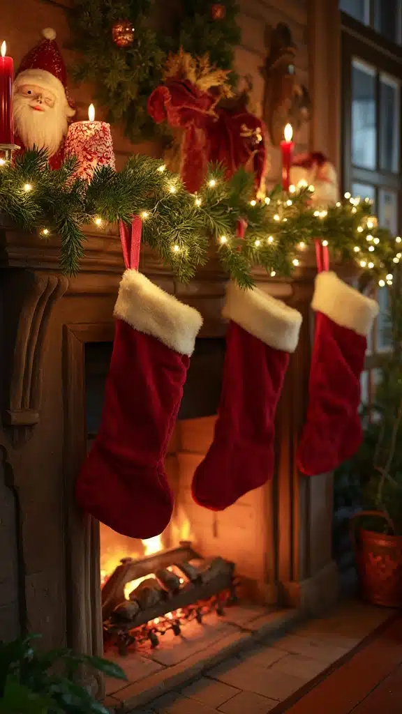 Rustic stockings add texture, tying the setup together with a cozy, handmade feel. This organic holiday decor radiates warmth, offering an inviting and aromatic centerpiece perfect for any mantel this season.