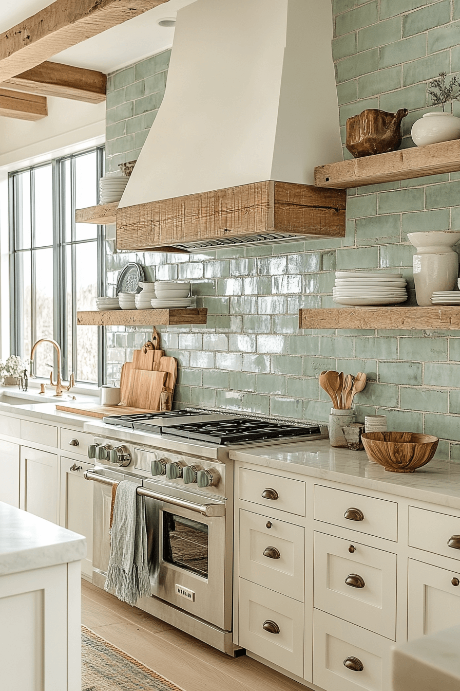 A soft wash of seafoam green instantly introduces coastal calm, making it one of the most soothing coastal kitchen backsplash ideas for light and airy interiors. The gentle hue reflects light beautifully while pairing effortlessly with white stone and pale wood finishes. Subtle shine across the tile surface enhances openness without feeling flashy. The overall effect feels relaxed, breezy, and refreshingly coastal. Color remains present without overwhelming the space. Explore coastal kitchen backsplash ideas that capture soft ocean energy.